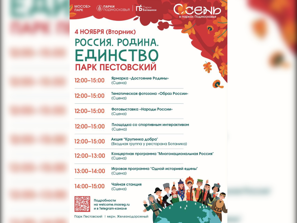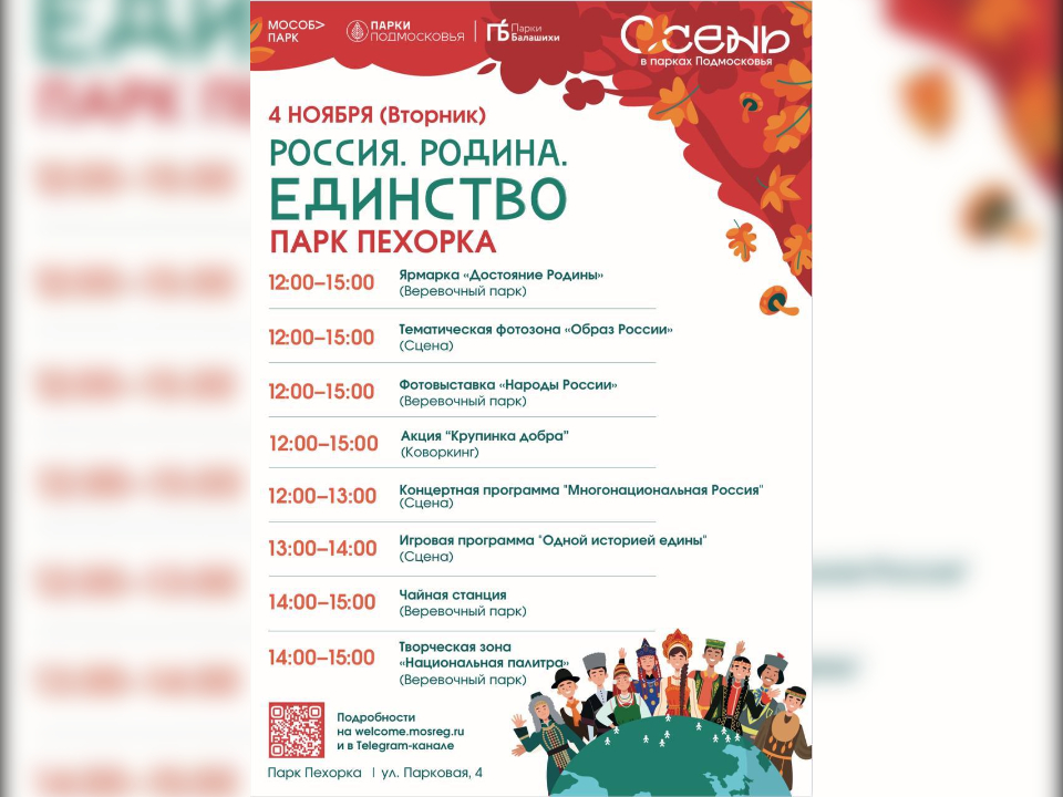 Праздничная программа «Россия. Родина. Единство» начнется в парках Балашихи 4 ноября в 12:00. Основная часть мероприятий развернется в парках «Пехорка» и «Пестовском».