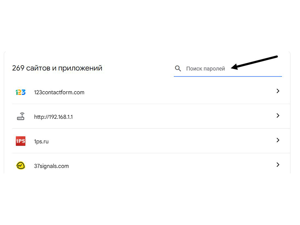4. В открывшемся списке сайтов найдите нужный почтовый сервис (например, mail.ru, yandex.ru или gmail.com). Вы можете воспользоваться строкой поиска.. Напротив названия сайта нажмите на значок в виде глаза, чтобы отобразить скрытый символы пароль.