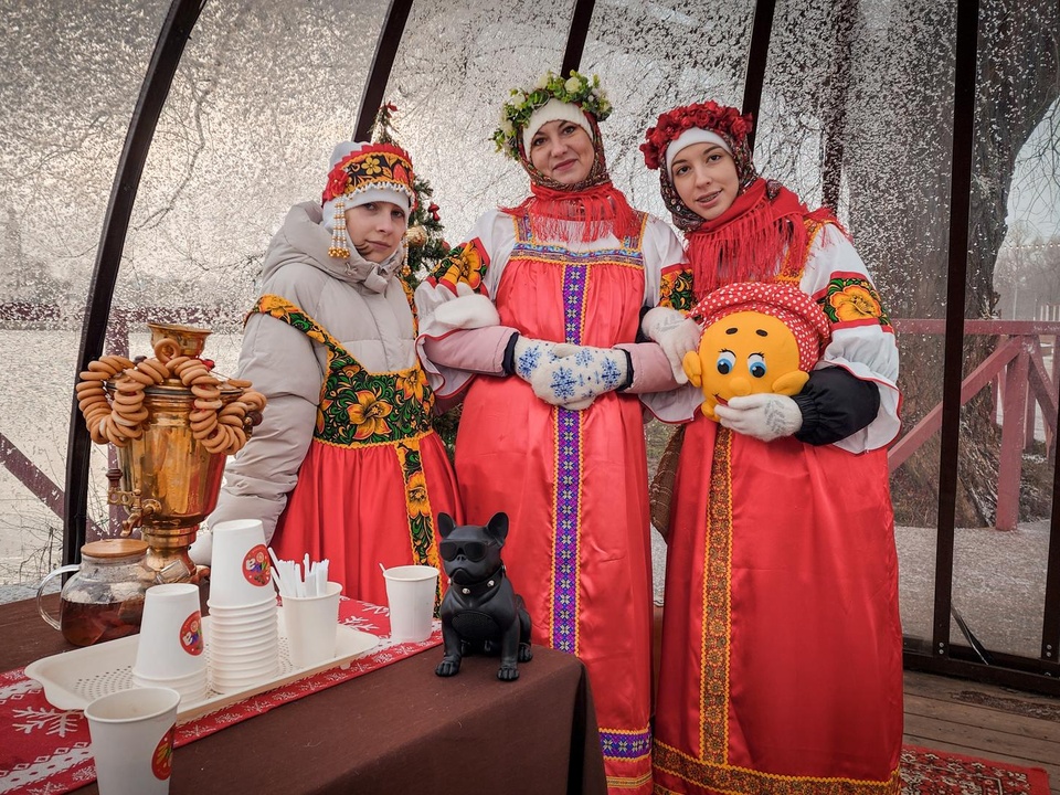 В купольной беседке гостей развлекают играми и угощают горячим чаем из самовара. Дежурные по празднику веселы и динамичны.