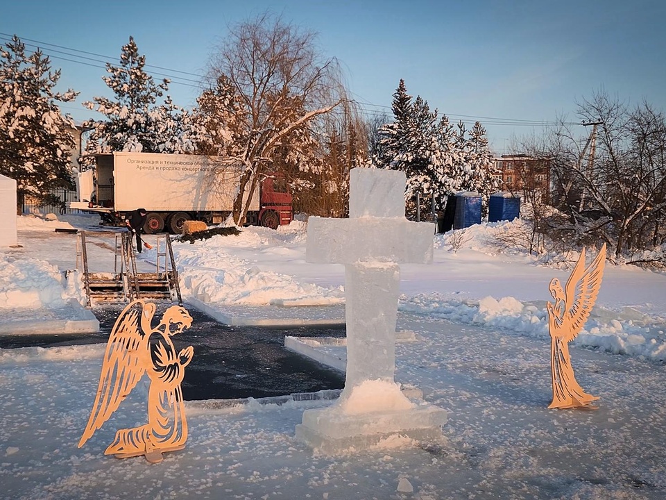 На берегу Совхозного пруда кипит работа: здесь завершают подготовку к крещенским купаниям. Главная купель уже вырублена в виде креста, а рядом установили ледяную скульптуру — христианский крест. За ночь иордань успела подмерзнуть, поэтому рабочие вновь взялись за бензопилы, чтобы убрать наросший лед.