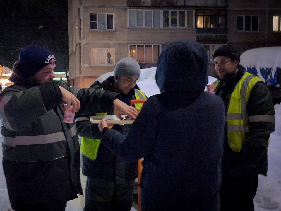 Отдельная снегоуборочная бригада приехала во двор на Советской улице после шести вечера, а работу завершили только к полуночи. Особенно тронул спецов душевный жест одной из жительниц, которая вынесла им горячий чай с конфетами.