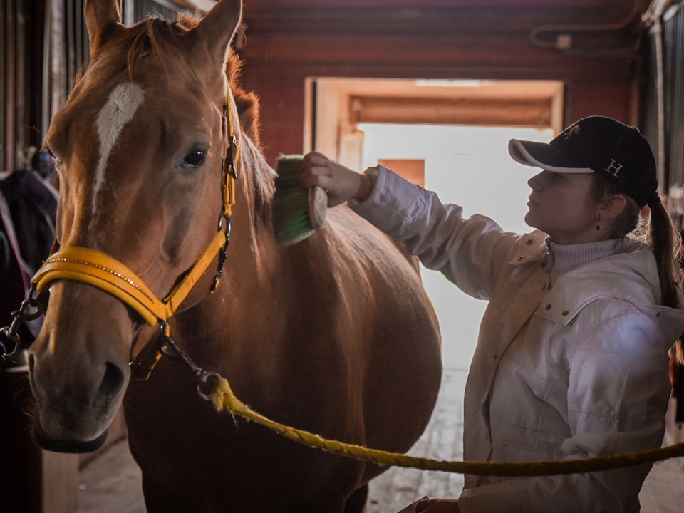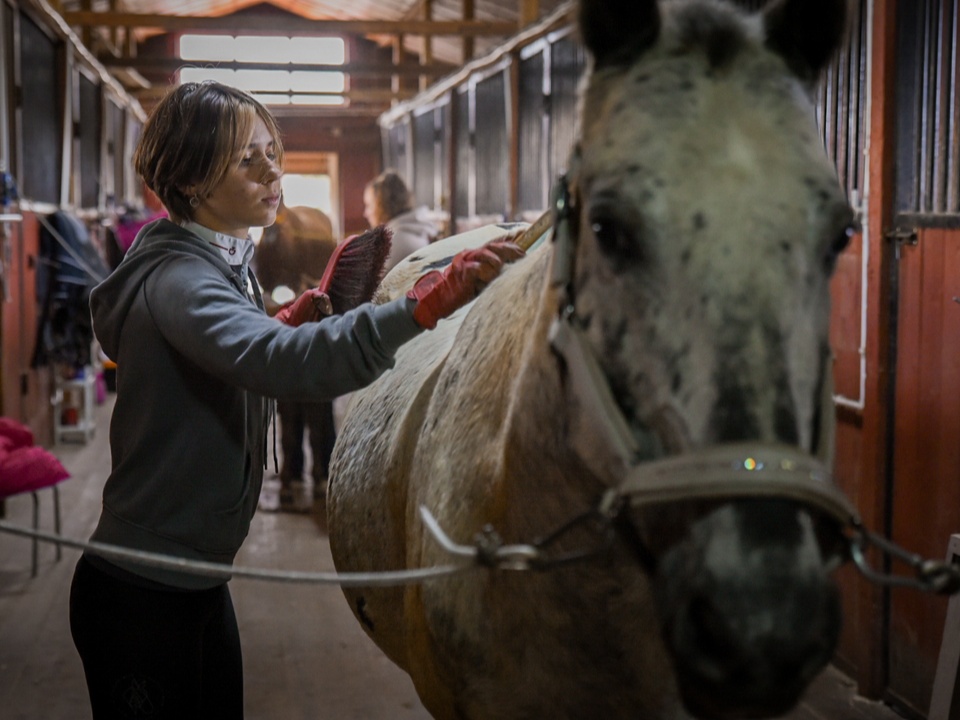 Шестнадцатилетняя Полина уже 5 лет занимается конным спортом. Решение прийти в клуб было спонтанным — увидела, как знакомая катается, и решила тоже попробовать. Сейчас Полина тренируется и выступает со своим конем на соревнованиях по конкуру. Они уже заняли несколько призовых мест.