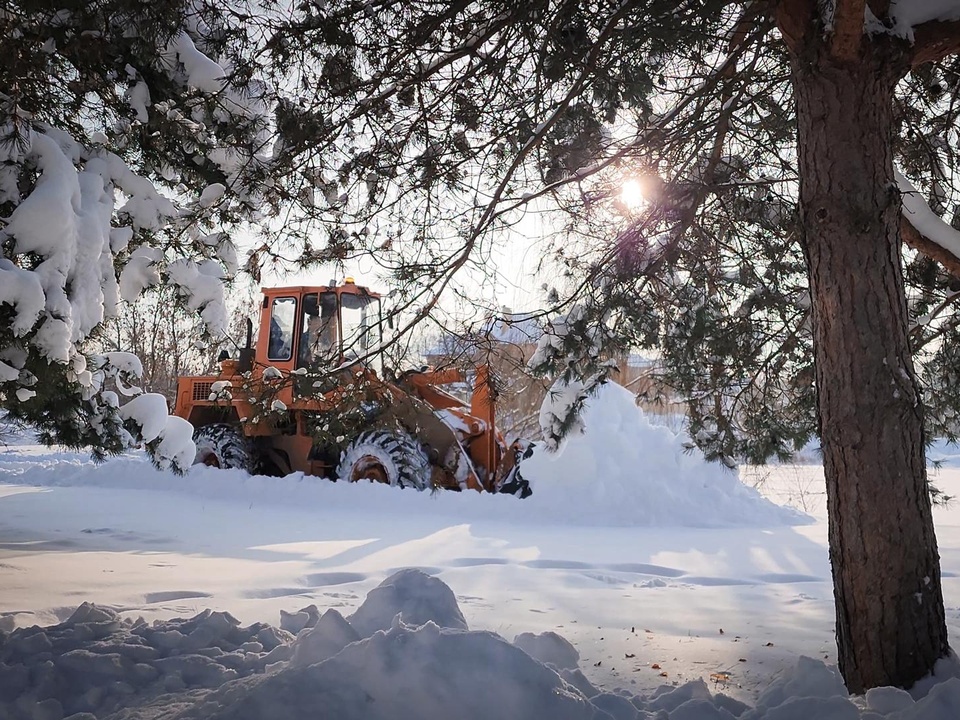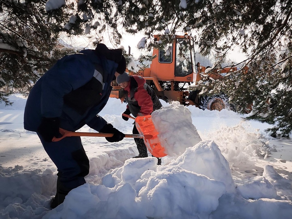 На территории около Совхозного пруда в Бронницах работает коммунальная техника: трактор расчищает от снега поле, а коммунальщики с лопатами — дорожки и деревянный мостик. Расчистили и автомобильную парковку. Совхозный пруд — единственная официальная точка для купаний в Бронницах.