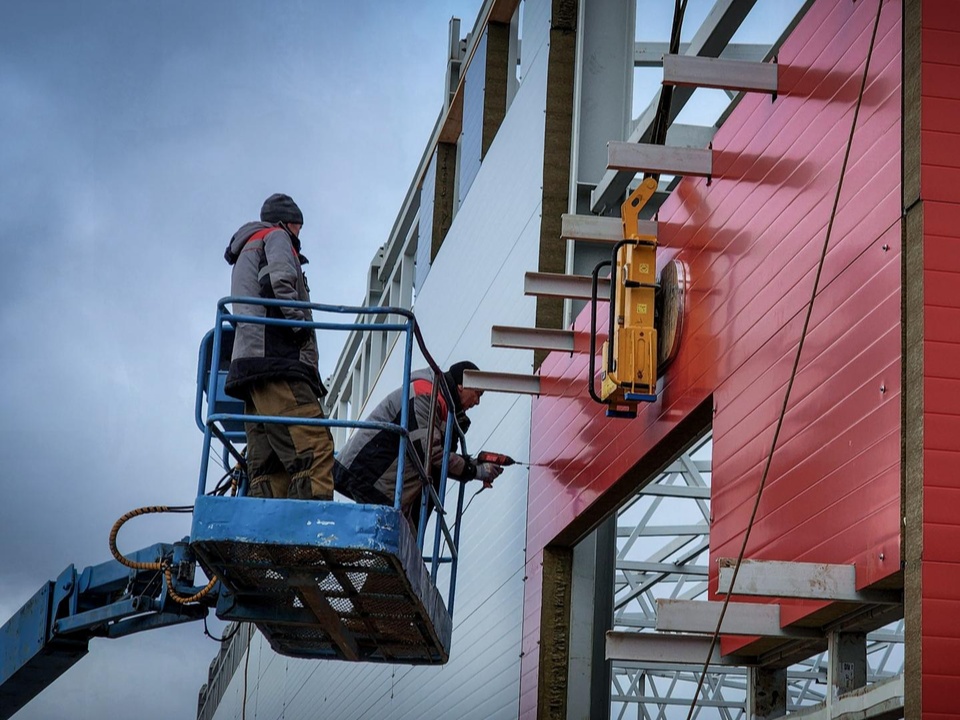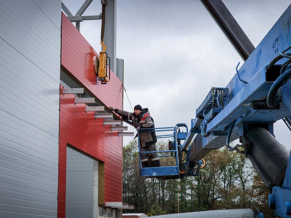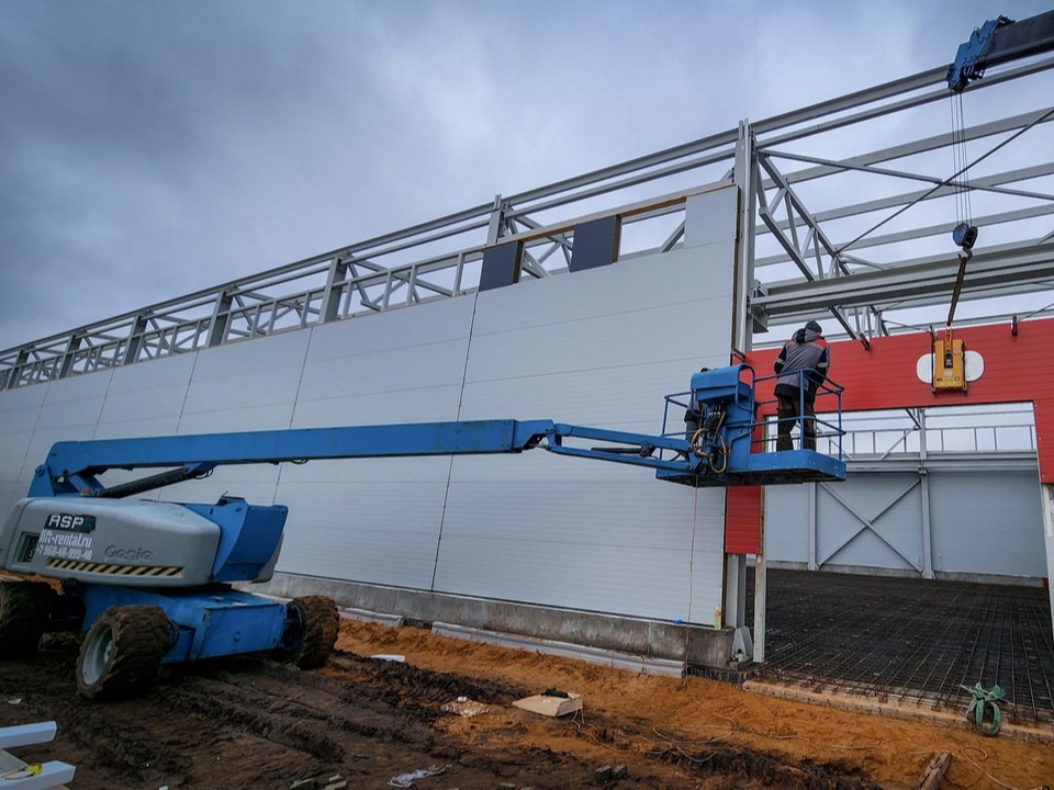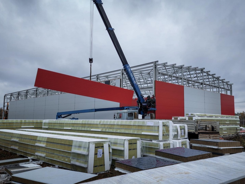 В Бронницах продолжается строительство нового производственного цеха. Металлический каркас здания уже полностью готов, и сейчас рабочие приступили к установке сэндвич-панелей и подготовке основания для будущего пола.