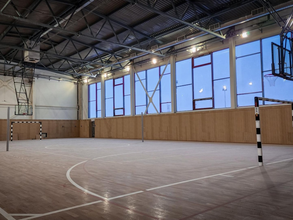 Отделку интерьеров выполнили в соответствии с противопожарными нормами и брендбуком, утвержденным Минспортом, — красно-белая цветовая гамма. Во влажных помещениях стены и полы выложены плиткой. В тренажерном зале на стенах установили большие зеркала, на пол постелили линолеум и уложили специальное противоударное резиновое покрытие. В универсальном спортивном зале полы покрыты паркетом. Установлены баскетбольные корзины и футбольные ворота.