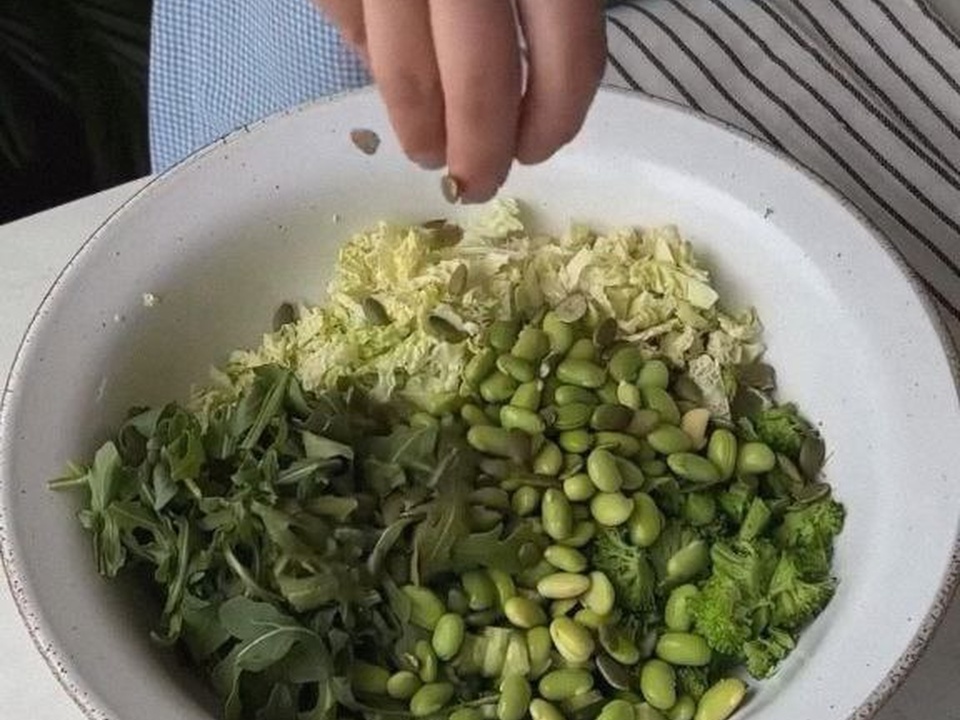 «В чем главная фишка: это бесконечный салат. Компоненты можно подбирать и варьировать. Сегодня это — пекинка, зеленый горошек и огурец, завтра — брокколи, бобы эдамаме или резаная фасоль. Курицу может сменить пастрома из индейки или ростбиф. Творите, фантазируйте, ешьте вкусно!» — комментирует шеф Иванова.