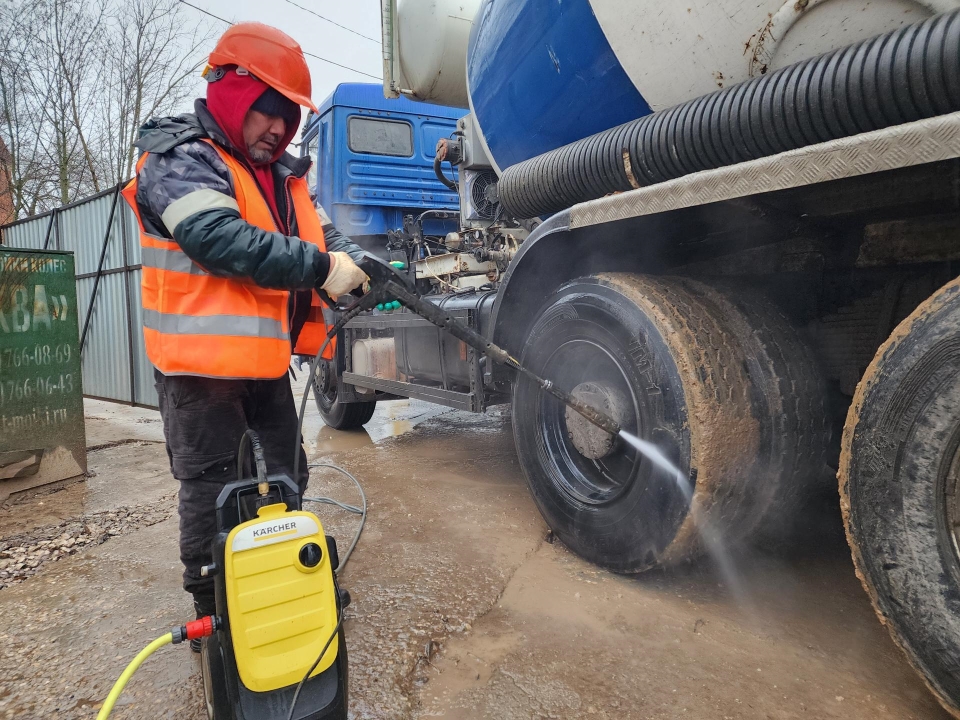 Компания соблюдает требования к чистоте подъездных дорог: у въезда на стройплощадку установили мойку для колёс грузовых машин.