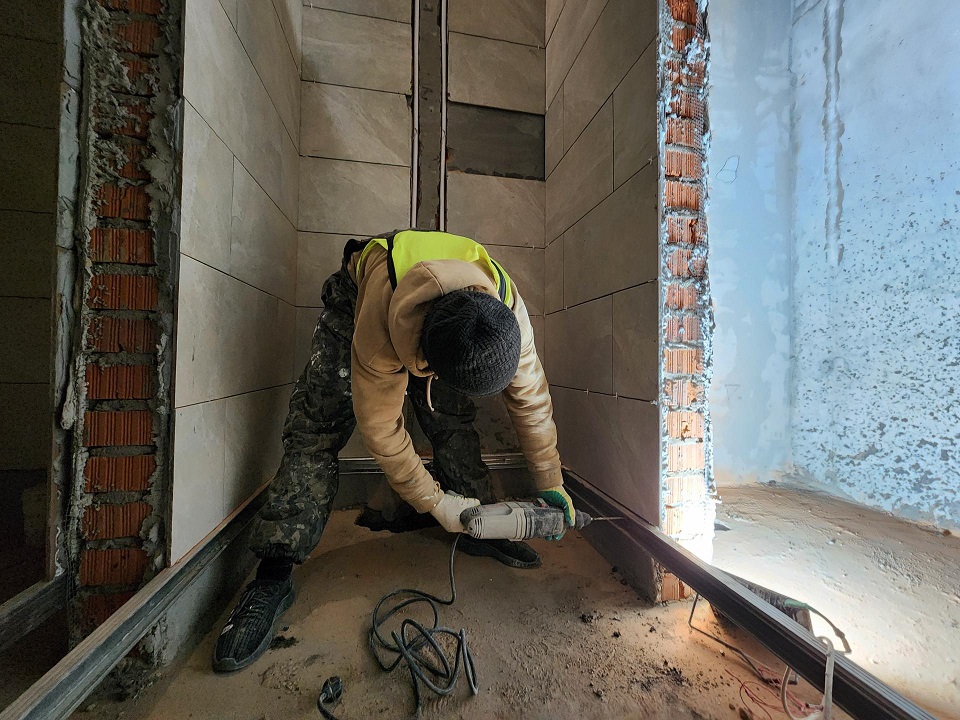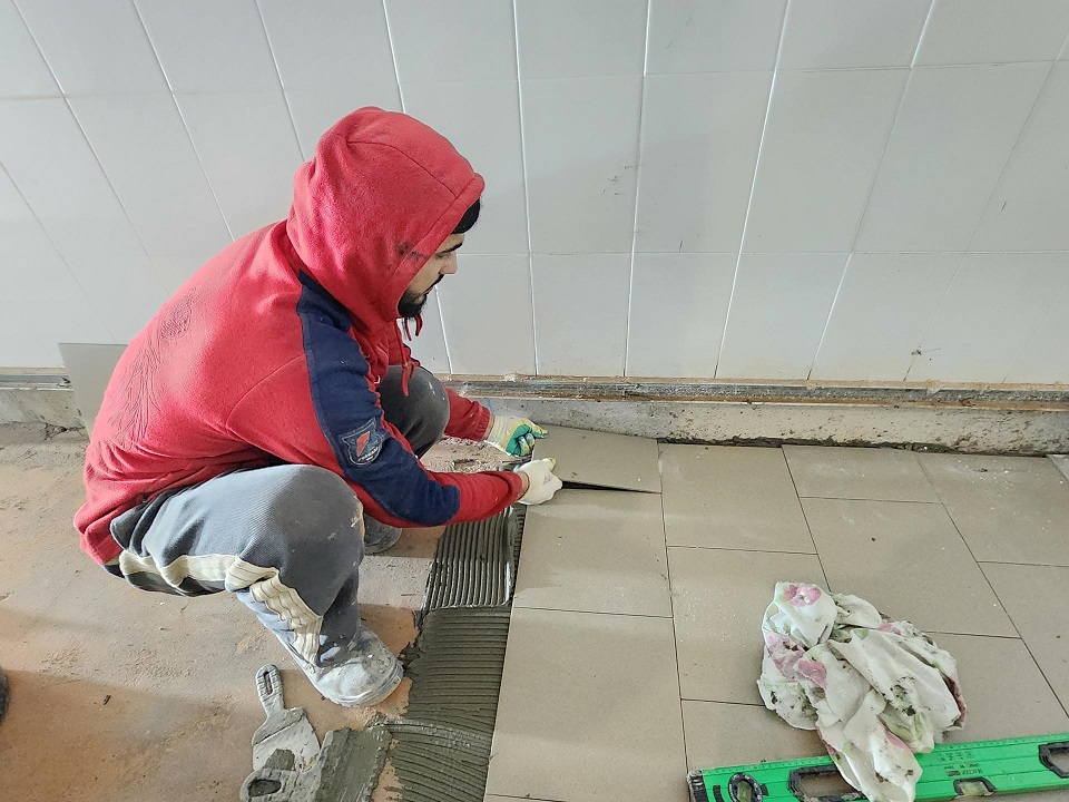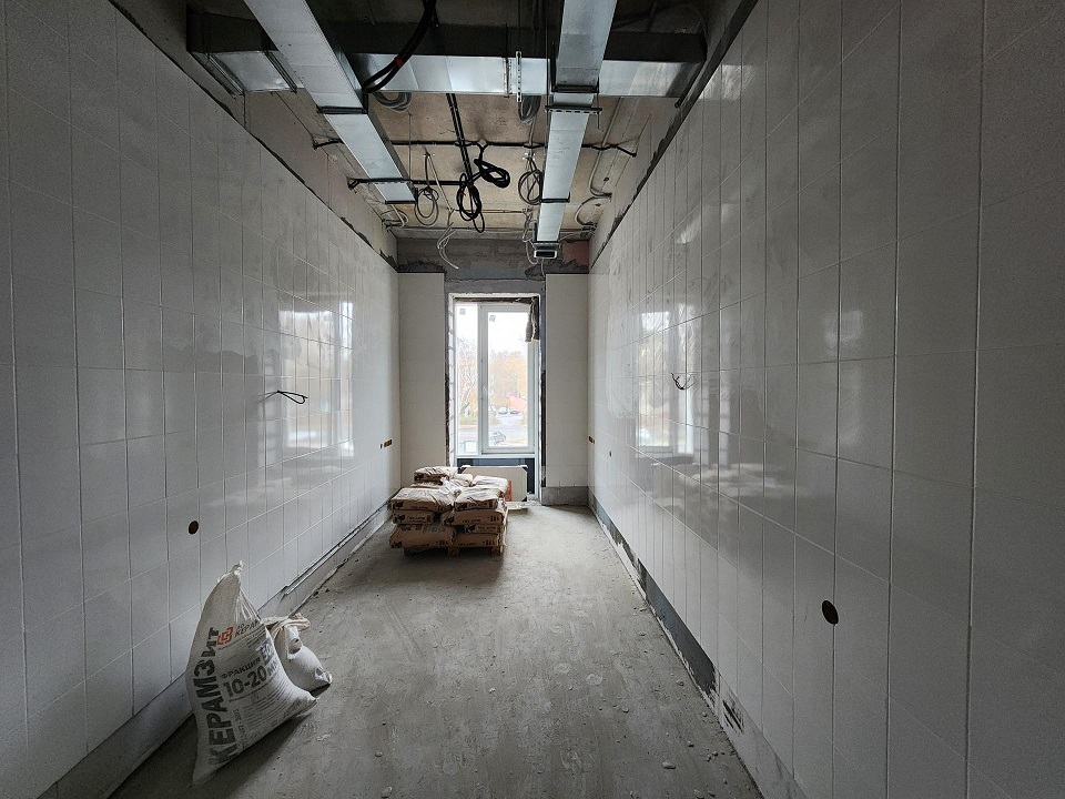 Внутри здания рабочие завершили кирпичную кладку, возвели перегородки. На 100% оштукатурили стены и потолки, на 60-70% ошпаклевали поверхности под покраску. На стены и полы технических помещений, в том числе подвальных, укладывают керамическую плитку и керамогранит.