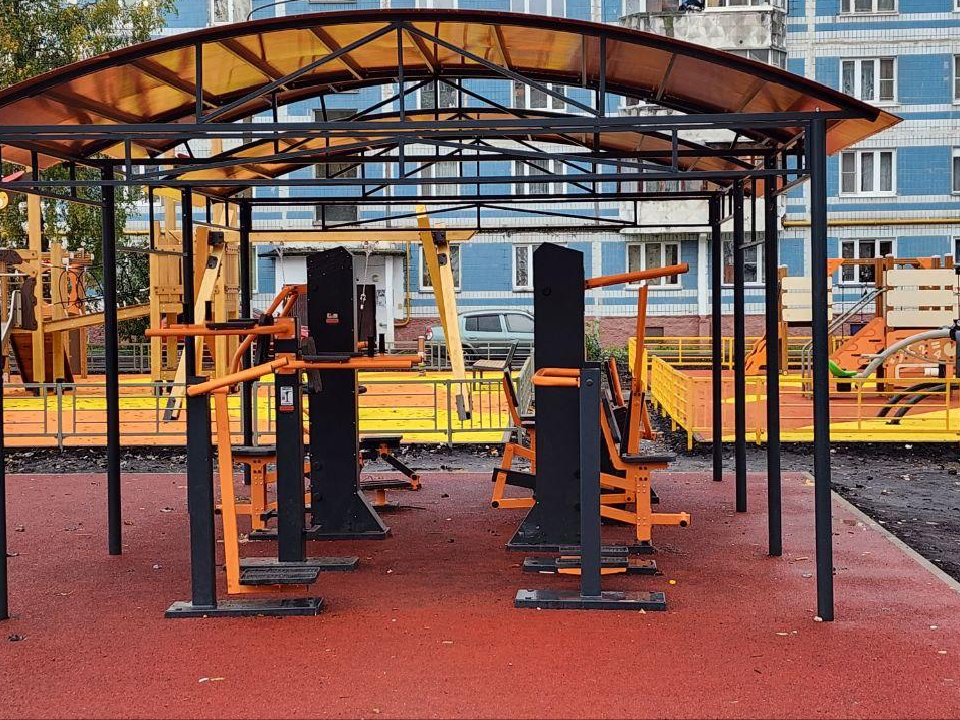 Особое внимание уделено подросткам и взрослым: на воркаут-площадке смонтирована тренажерная беседка с крышей, позволяющая заниматься даже в дождливую погоду. Здесь размещены 11 функциональных тренажеров на все группы мышц, а также перекладины для подтягивания и брусья для отжиманий.