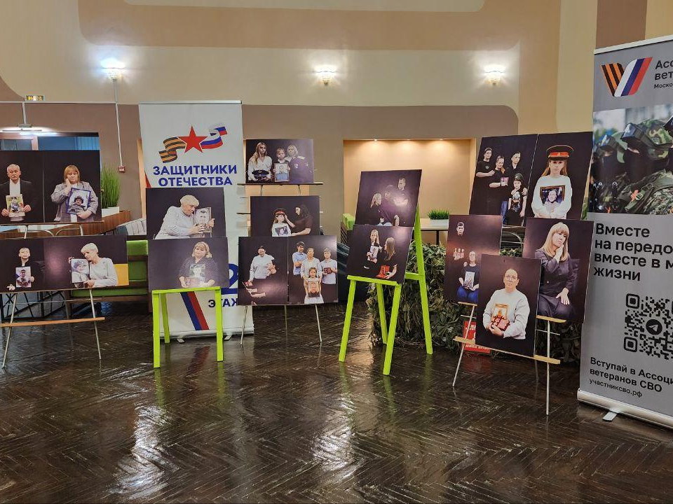 В фойе ЦКР «Синьковский» разместилась и фотовыставка, подготовленная активистками дмитровского отделения государственного фонда «Защитники Отечества». На снимках — семьи участников СВО, запечатленные профессиональными фотографами. На многих портретах родные держат в руках фотографии погибших героев, символизируя связь между памятью, любовью и подвигом.