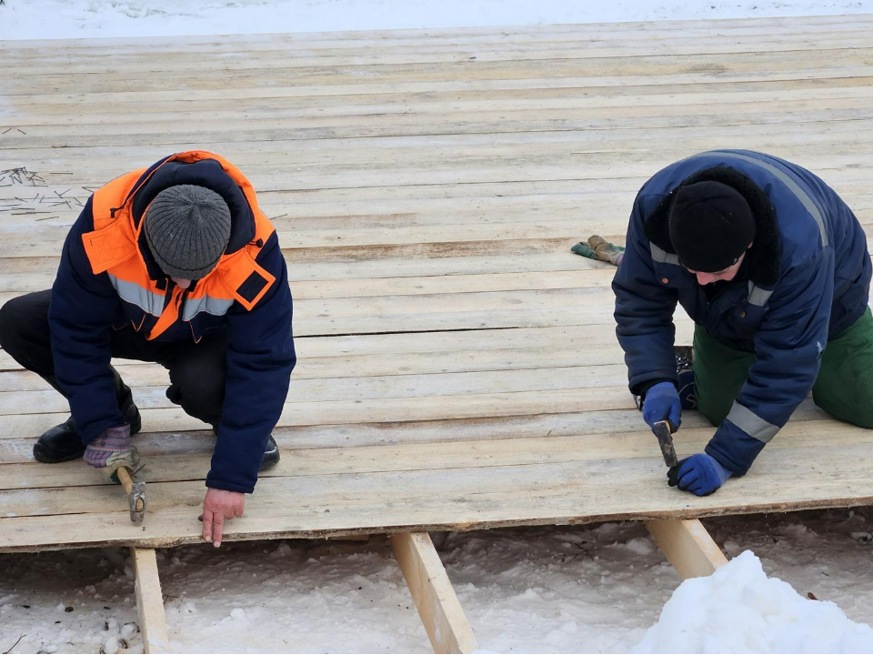 Ключевые этапы обустройства начались утром 16 января. Во льду вырезаны две прямоугольные проруби — мужская и женская, подведено электричество, уложен деревянный настил, установлены прочные перила, возведена ледяная основа под арку.