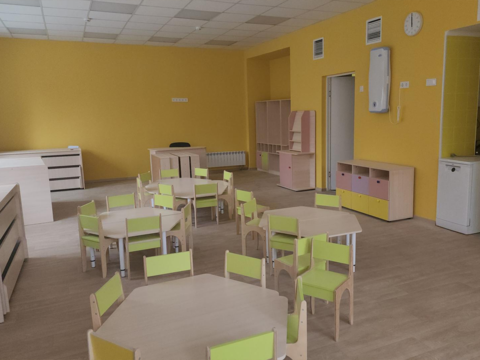 Здание детского сада, построенное в 1963 году, впервые прошло капитальное обновление. После ремонта фасад стал современным и ярким — его украсили панели трех цветов. Внутри выполнены работы по замене коммуникаций, установлены подвесные потолки с мощным освещением и новая сантехника.