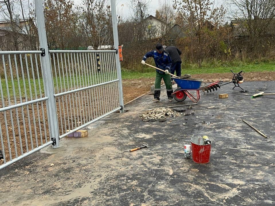Сейчас рабочие уже уложили асфальт. Они монтируют специальное трехуровневое ограждение. Оно не даст мячу вылететь за пределы спортивной площадки. Уже установлено около 40% металлических конструкции по периметру территории.