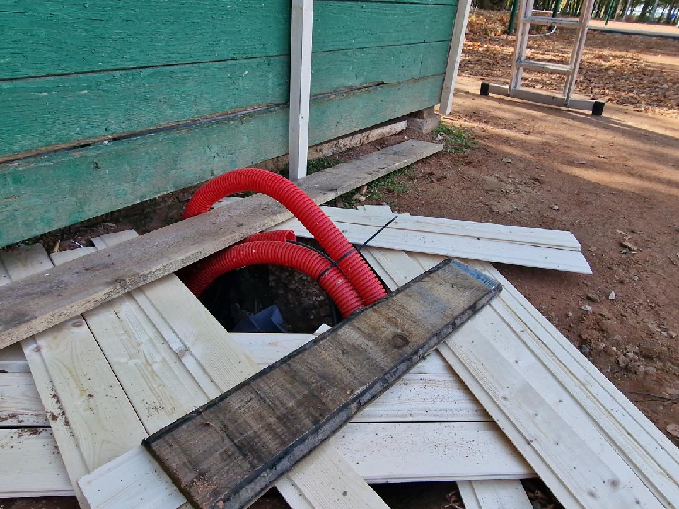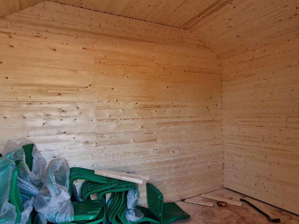 Параллельно идет ремонт домиков-раздевалок для спортсменов: стены снаружи и внутри обшивают деревянной вагонкой, а в помещения подводят электричество.