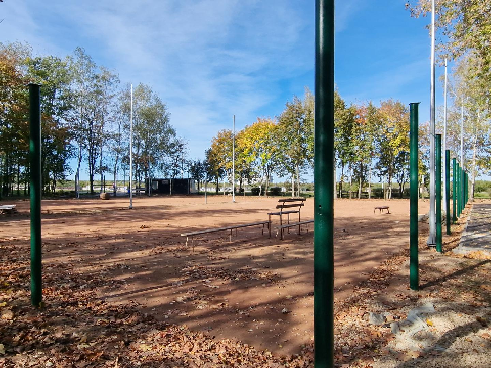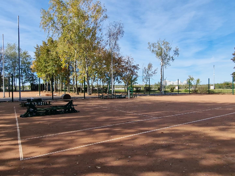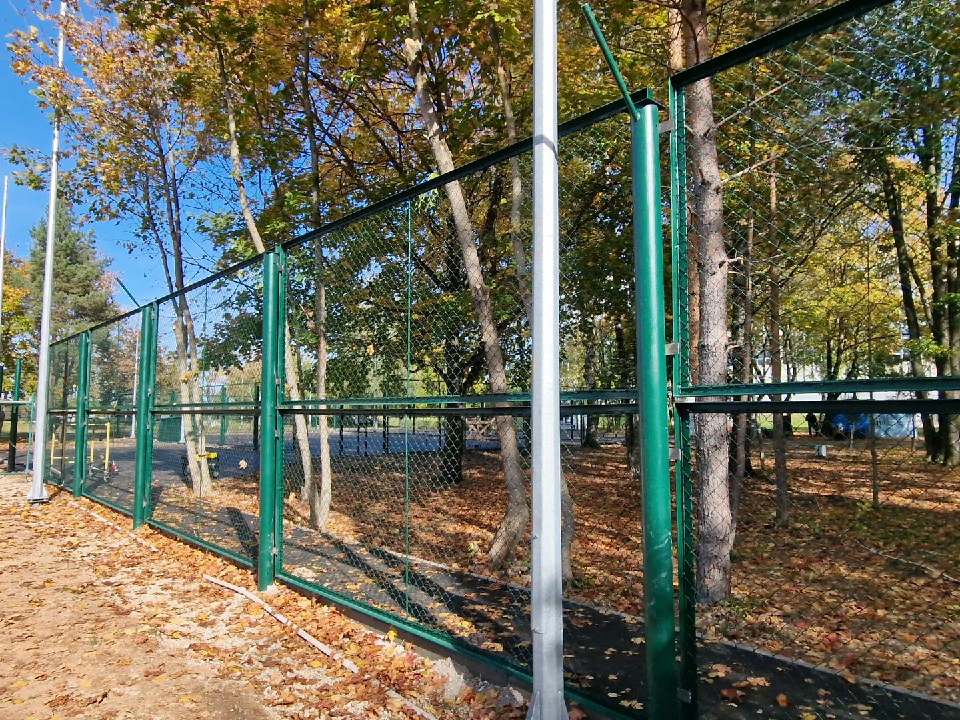 Старую заградительную сетку полностью демонтировали. Опоры тщательно зачистили, загрунтовали и покрасили, а теперь монтируют новые секции ограждений. По периметру кортов уже проложили электрический кабель и установили фонарные столбы — это обеспечит комфортное освещение во время вечерних тренировок.