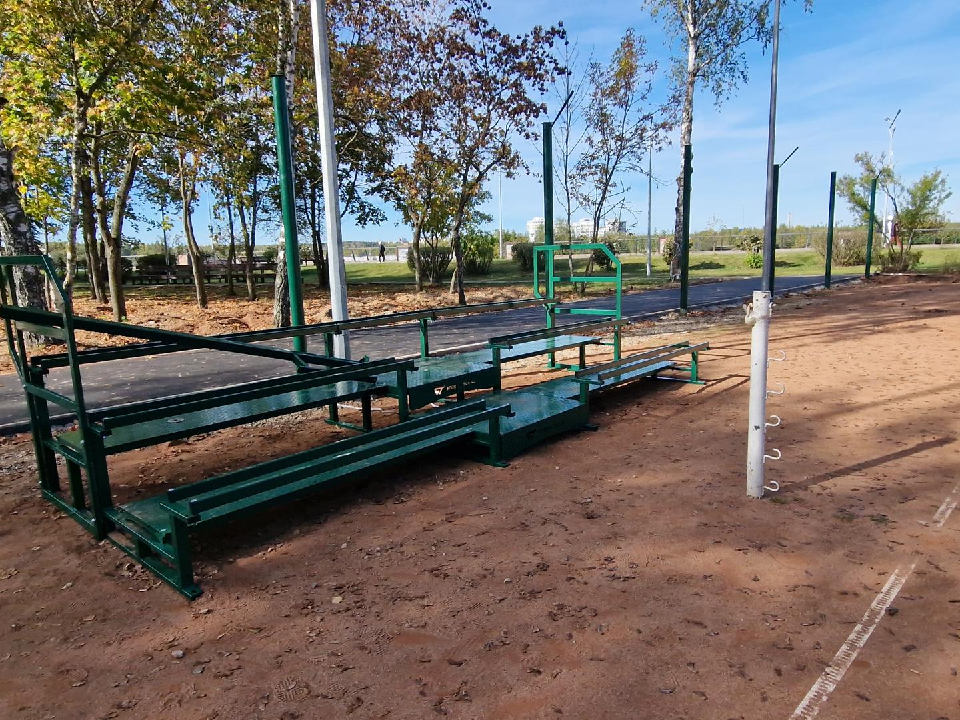 Новые трибуны уже доставлены на площадку. Их металлический каркас окрашен в темно-зеленый цвет, гармонирующий с ограждениями, а сиденья будут светло-зелеными. В ближайшее время также обновят судейские кресла.