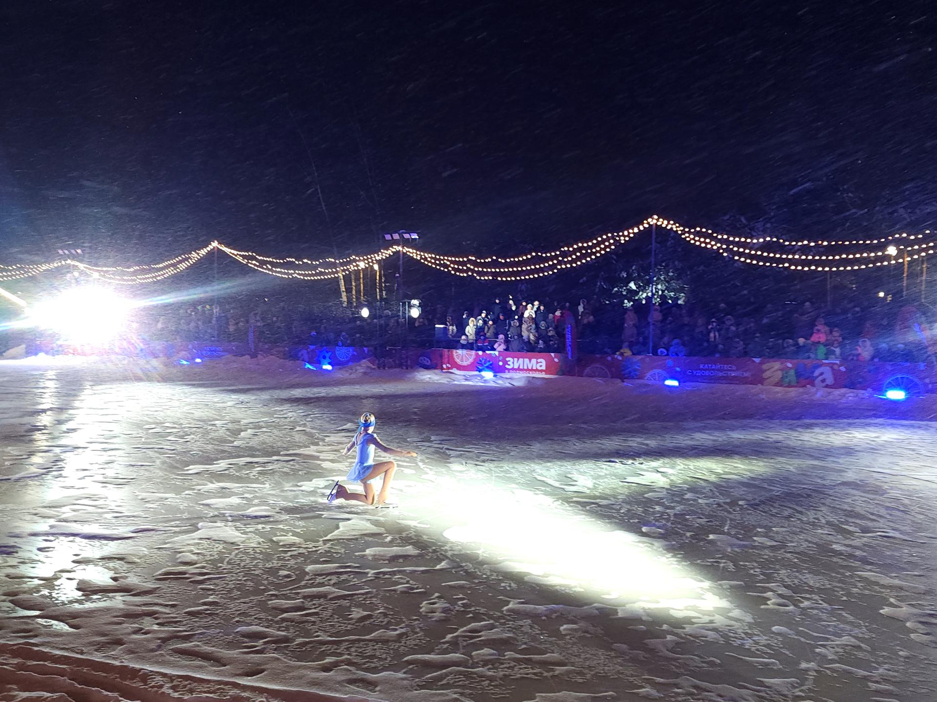 Многие горожане собрались в парке задолго до начала ледового шоу. Для них организовали развлечения сотрудники «Городских парков». Они в том числе помогали убирать снег с арт-площадки «Солнечная система» рядом с катком.