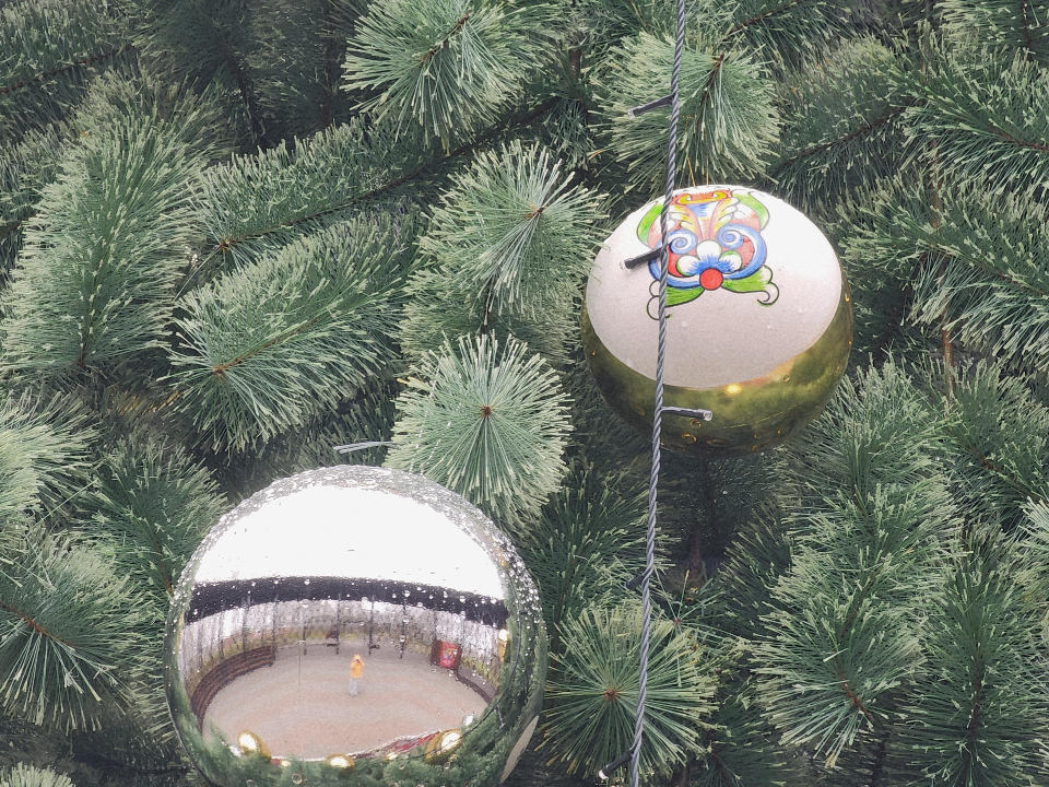 В центре локации «Корзина» дерево украсили шарами с гуслицкой росписью. Главную елку разместили у ярких домиков на территории «Деревня Простоквашино».