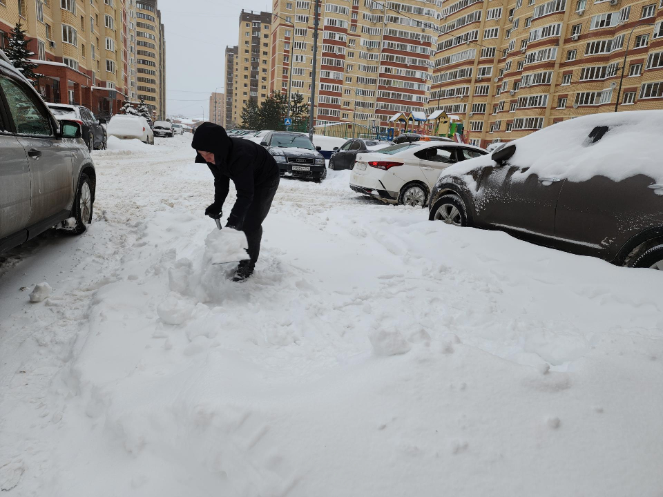 Жители помогают расчищать дворы и парковки. Некоторые выходят целыми семьями и помогают коммунальщикам, расчищая снег у своих машин.