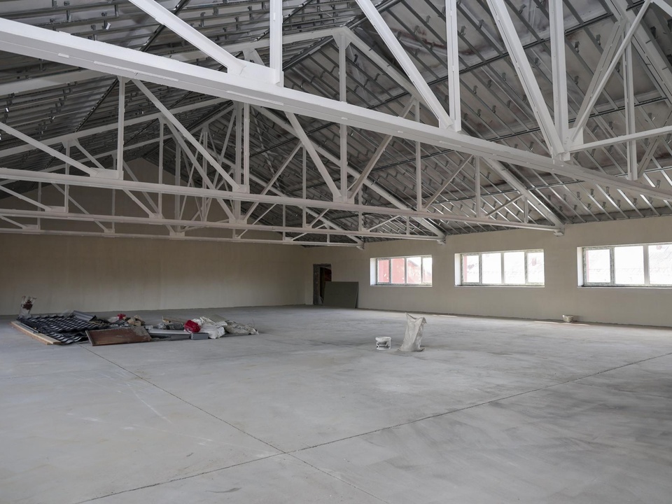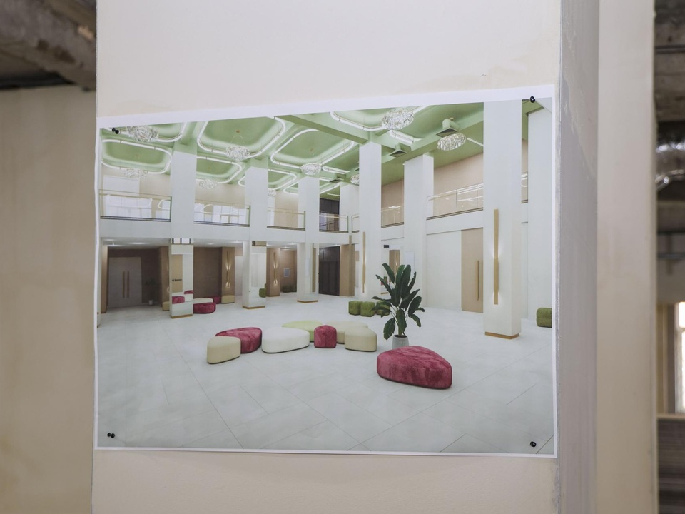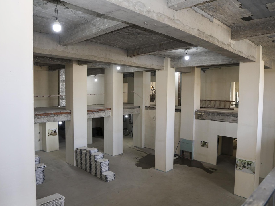 Сейчас в помещении проводятся штукатурные работы, монтаж каркасов для подвесных потолков и панорамных окон, прокладка инженерных коммуникаций.