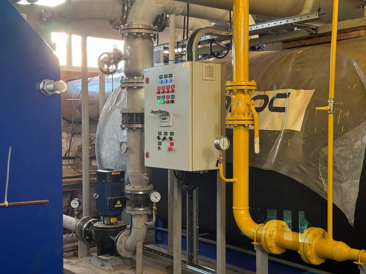 На объекте уже выполнены основные технические работы. «Сердце» котельной — два современных котла. Для системы горячего водоснабжения установлены и подключены насосы, а специалисты в настоящий момент монтируют трубопроводы и арматуру для их интеграции в общую сеть.