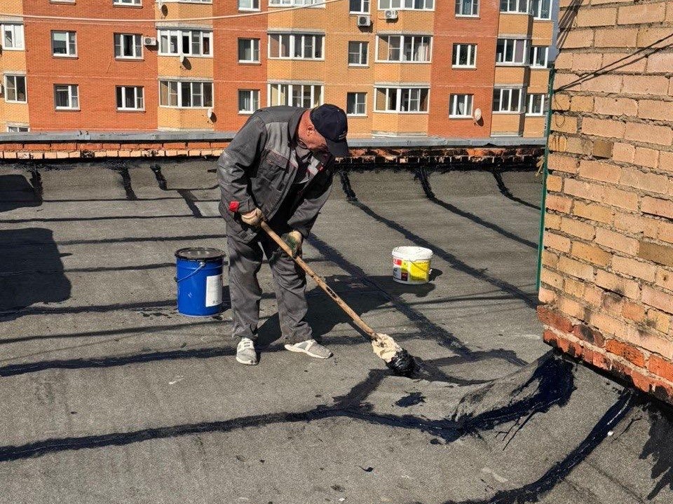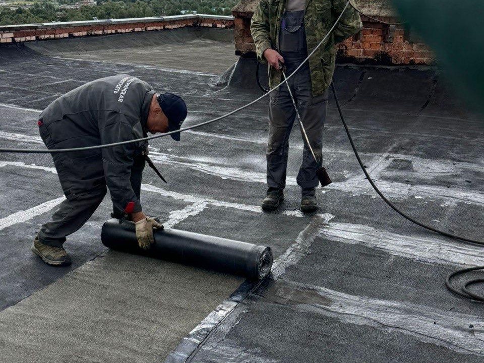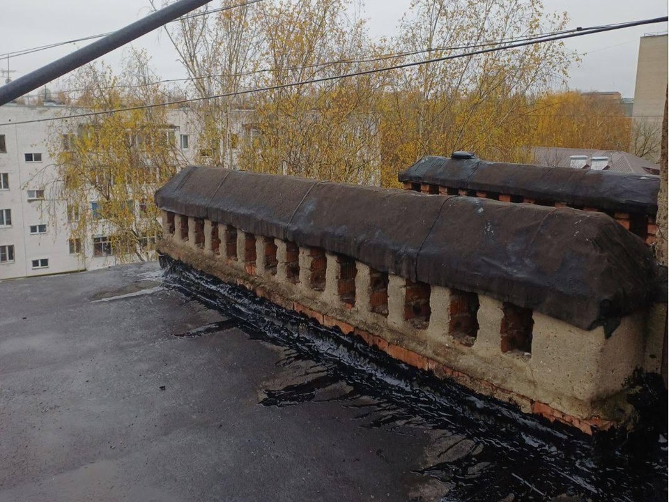 В перечень выполненных работ вошел целый ряд важных мероприятий. Специалисты провели полную или частичную замену мягкого рулонного покрытия и шиферных листов, тщательно промазали швы и примыкания битумной мастикой, выполнили герметизацию стыков специальным гермобутилом, а также отремонтировали коньки на шиферных кровлях.