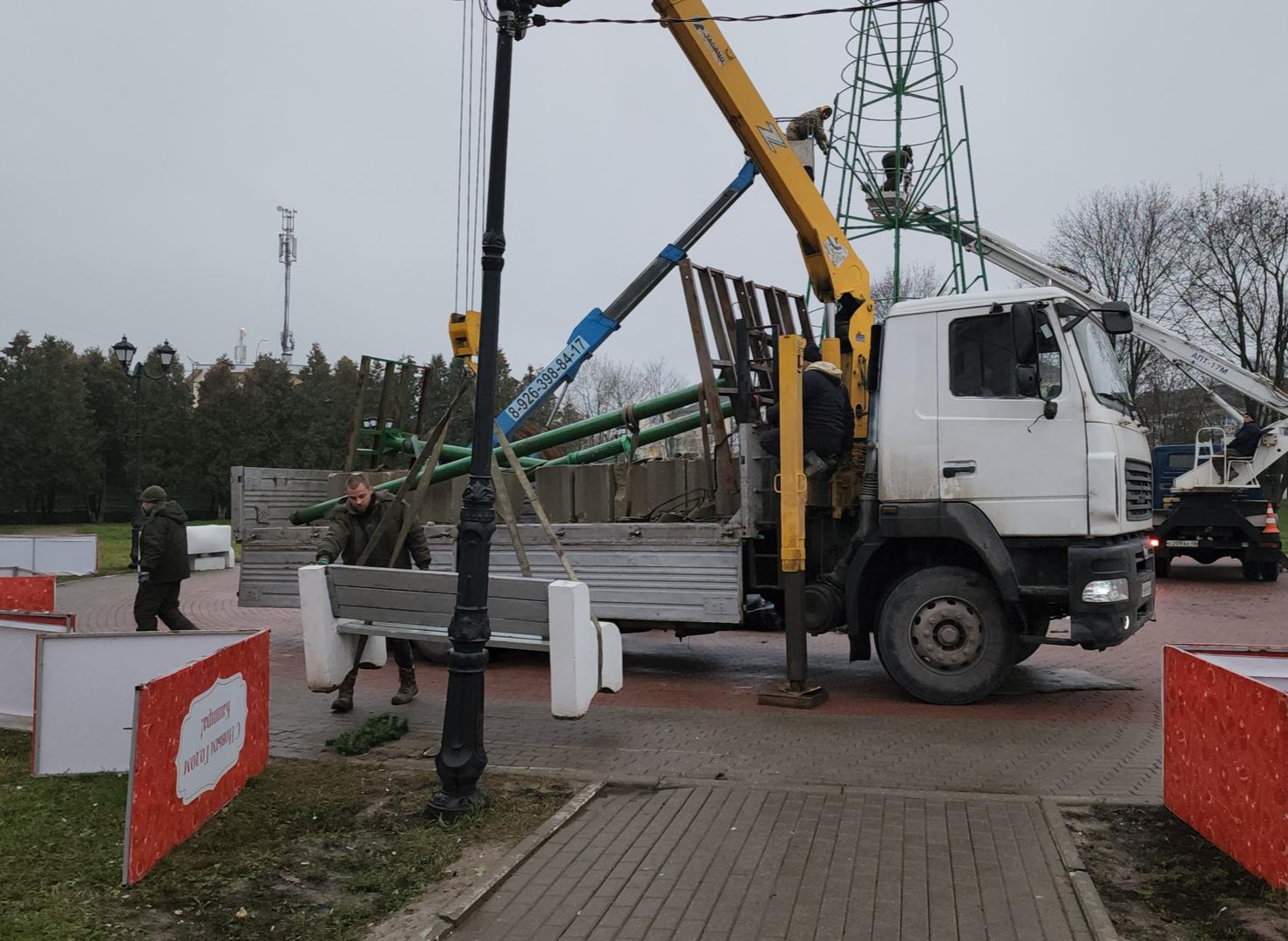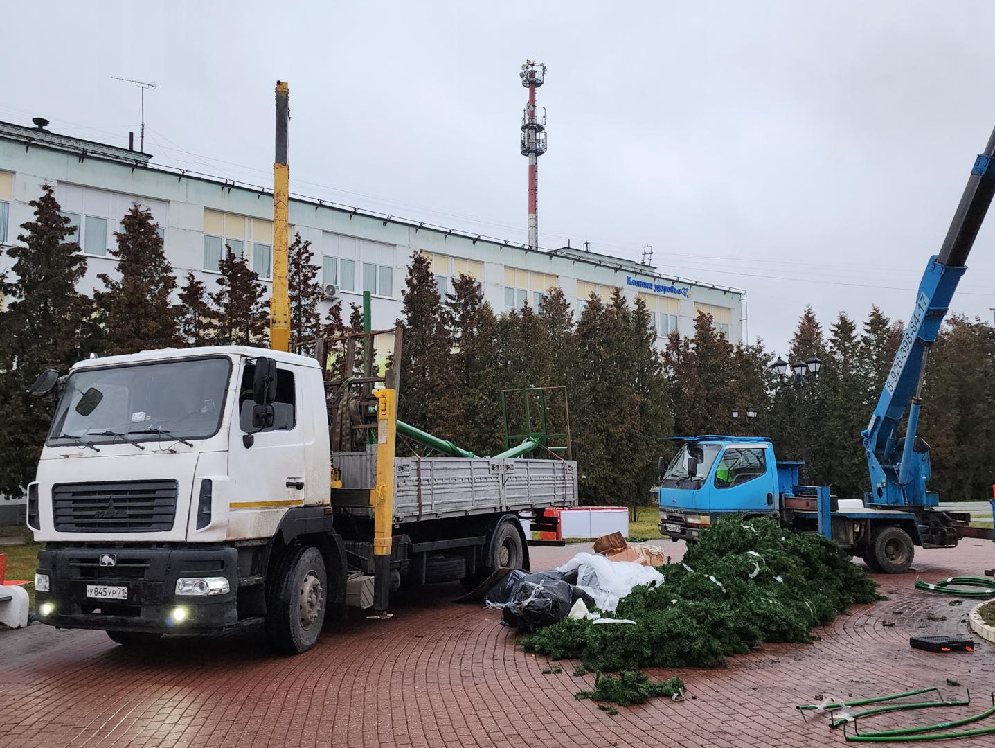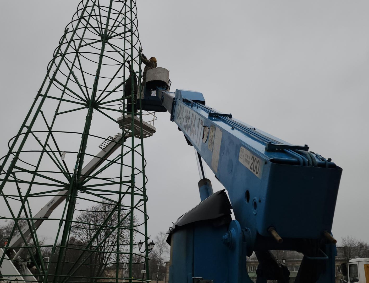 Работы по возведению уже идут: подрядчик из Рязани доставил на площадку все компоненты — металлоконструкцию, ветви и праздничные украшения. С помощью автовышек монтажники приступили к сборке искусственного дерева, которое достигает 15 м в высоту и четыре м в диаметре у основания.