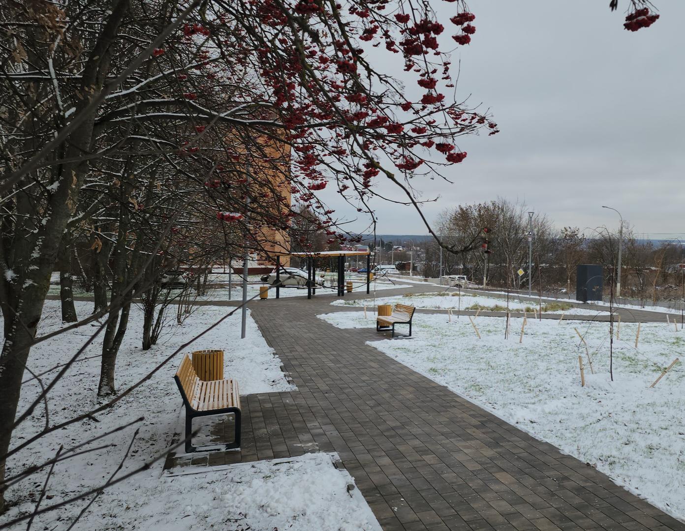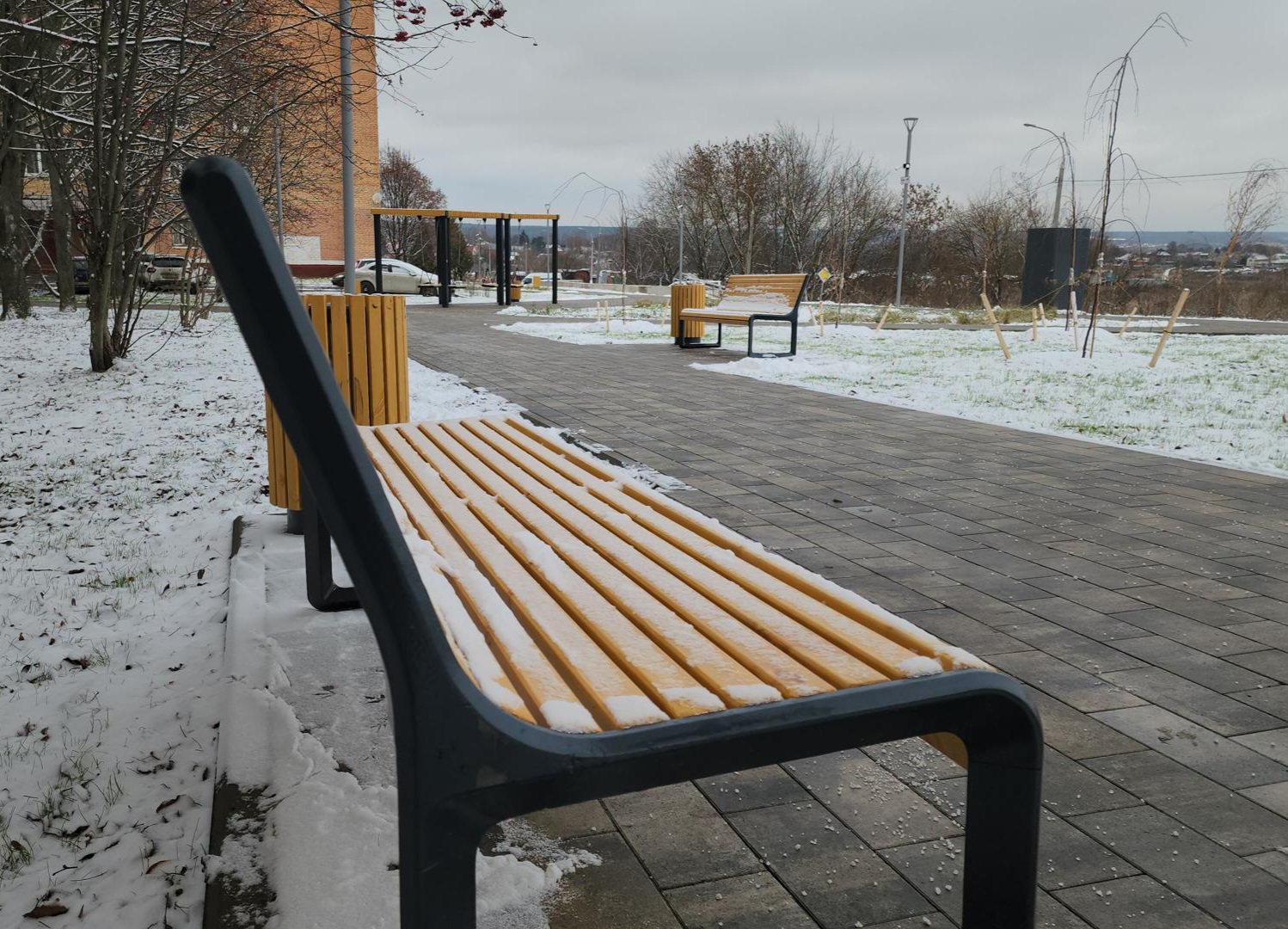 Новый сквер получил все необходимое для современного общественного пространства. Для отдыха горожан установлены четыре удобные скамейки и две стильные перголы с качелями, где можно провести время с книгой или в приятной беседе.