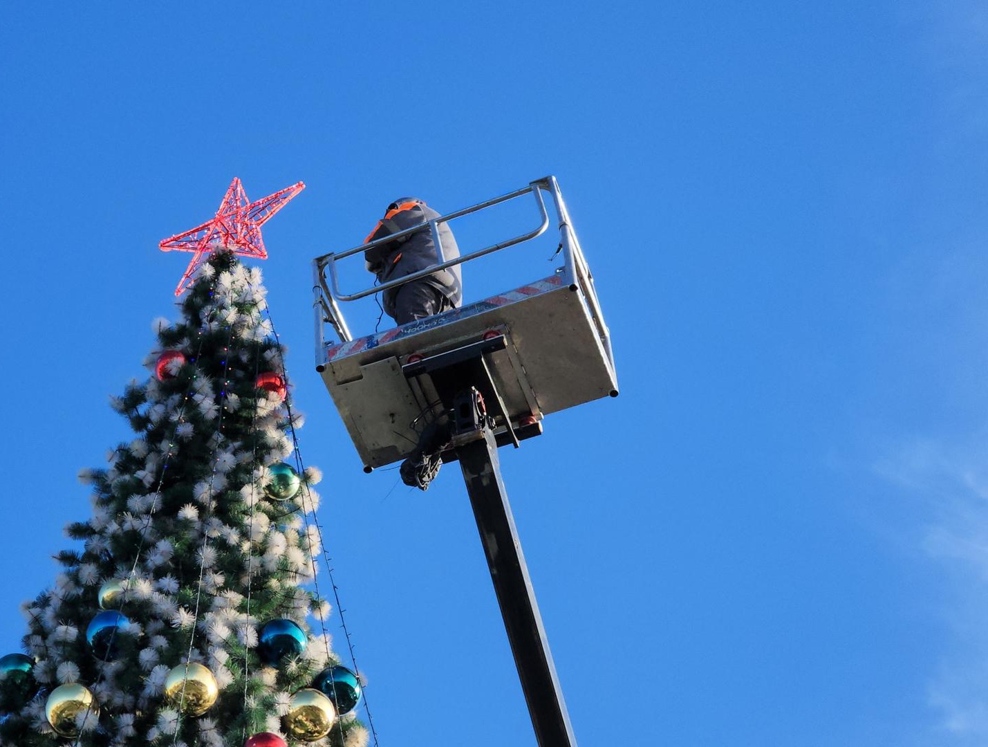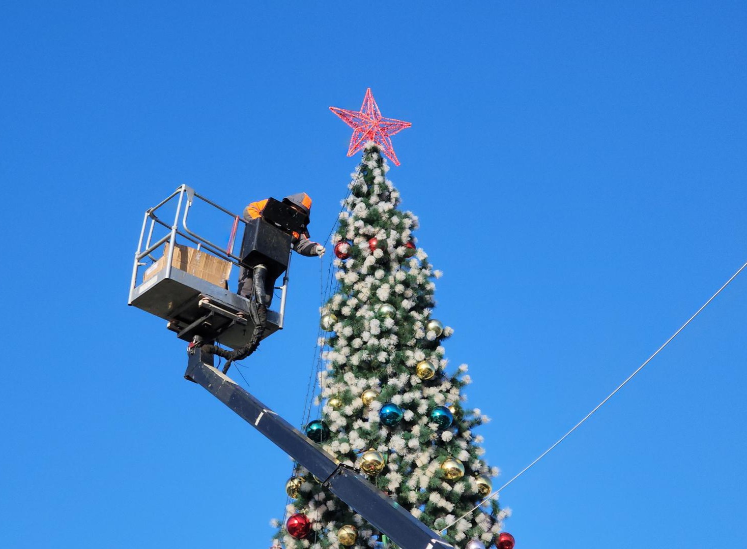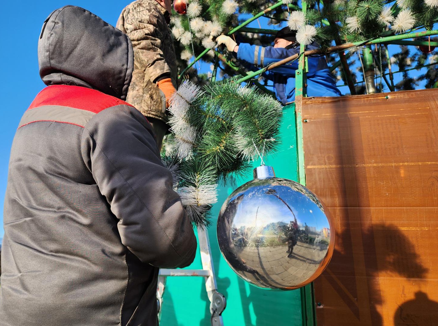 Затем наступил самый творческий этап — украшение. Елку нарядили в праздничный наряд из почти 300 шаров синего, красного, серебристого и золотого цветов. Венчает ее традиционная пятиконечная звезда, которая светится ярко-красным светом, а также 288 м гирлянд, что окутали дерево мерцающим сиянием. Подсветку уже протестировали, и в тот же вечер елка зажглась для жителей города.