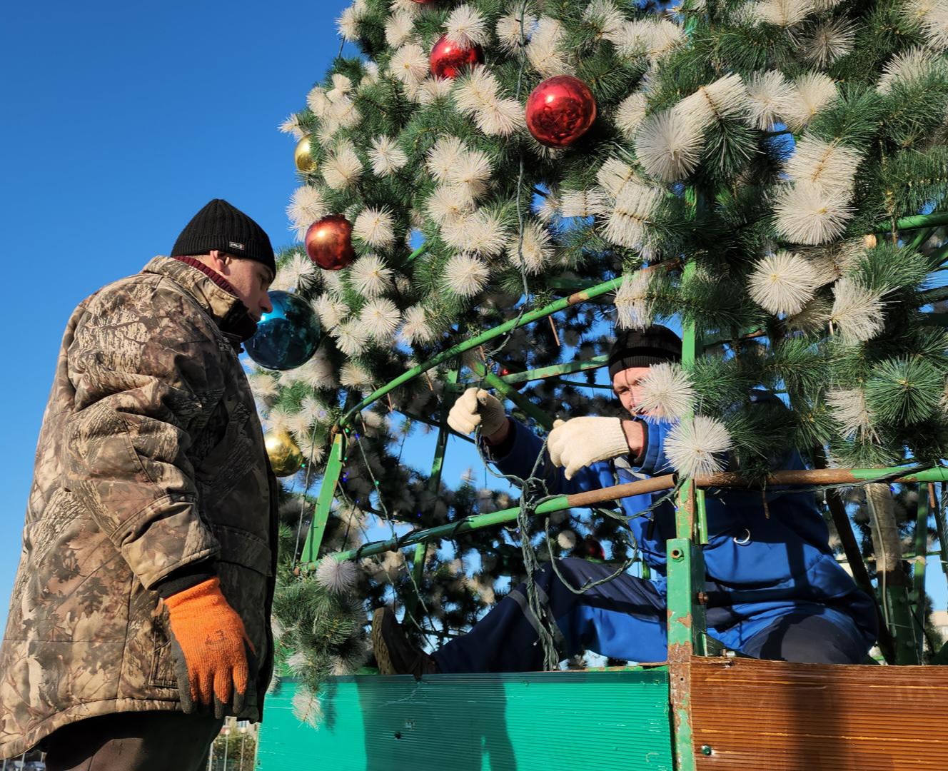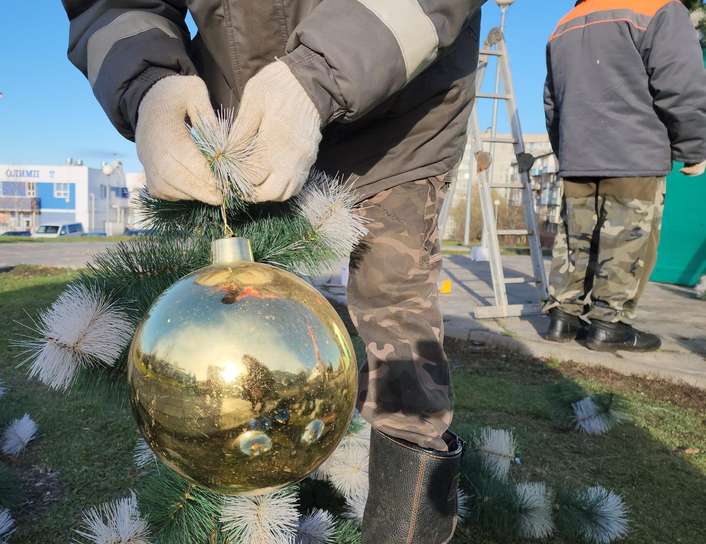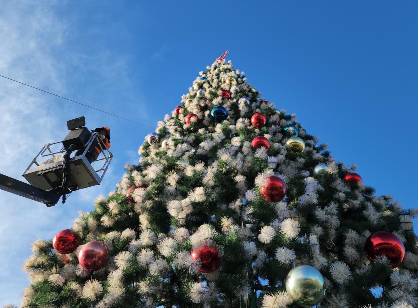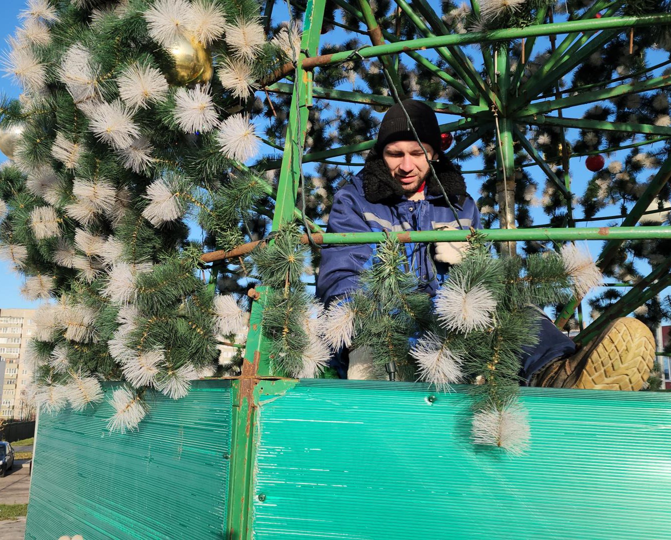 Затем наступил самый творческий этап — украшение. Елку нарядили в праздничный наряд из почти 300 шаров синего, красного, серебристого и золотого цветов. Венчает ее традиционная пятиконечная звезда, которая светится ярко-красным светом, а также 288 м гирлянд, что окутали дерево мерцающим сиянием. Подсветку уже протестировали, и в тот же вечер елка зажглась для жителей города.