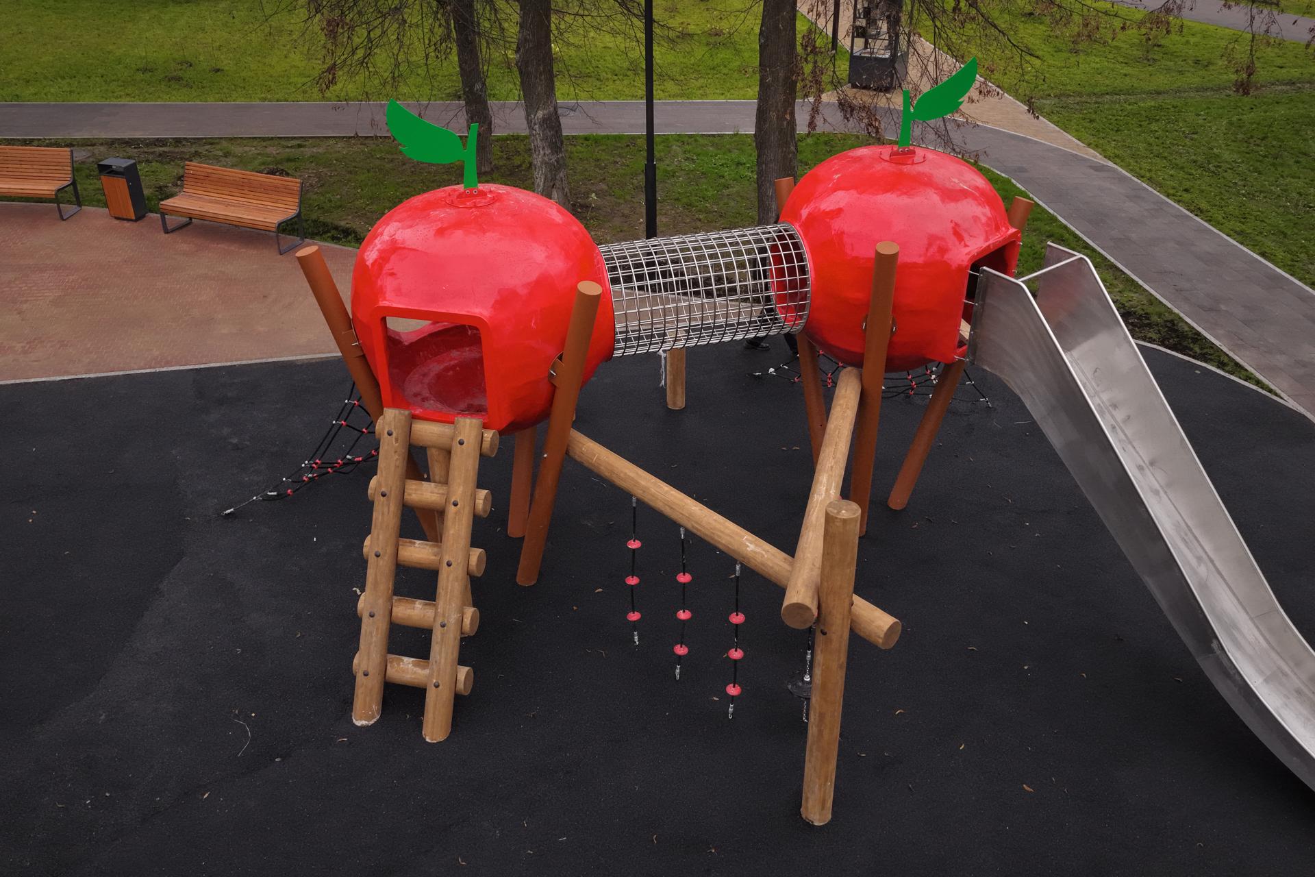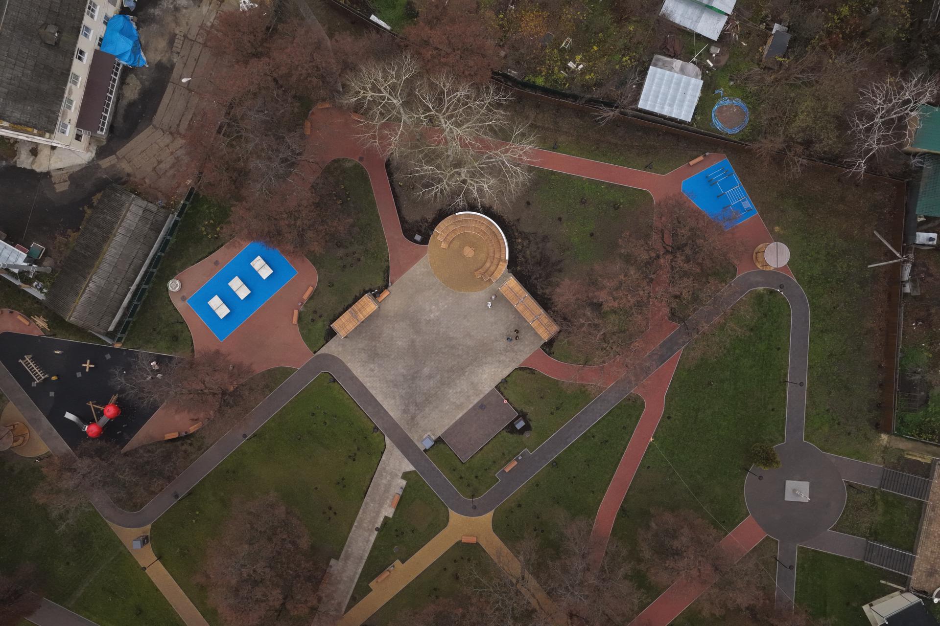 Летний сад превратился в многофункциональную площадку. Здесь построили четырехъярусный амфитеатр, круглые беседки, установили овальные арки на входах, оборудовали зоны для активного отдыха с столами для настольного тенниса и многофункциональную детскую площадку.