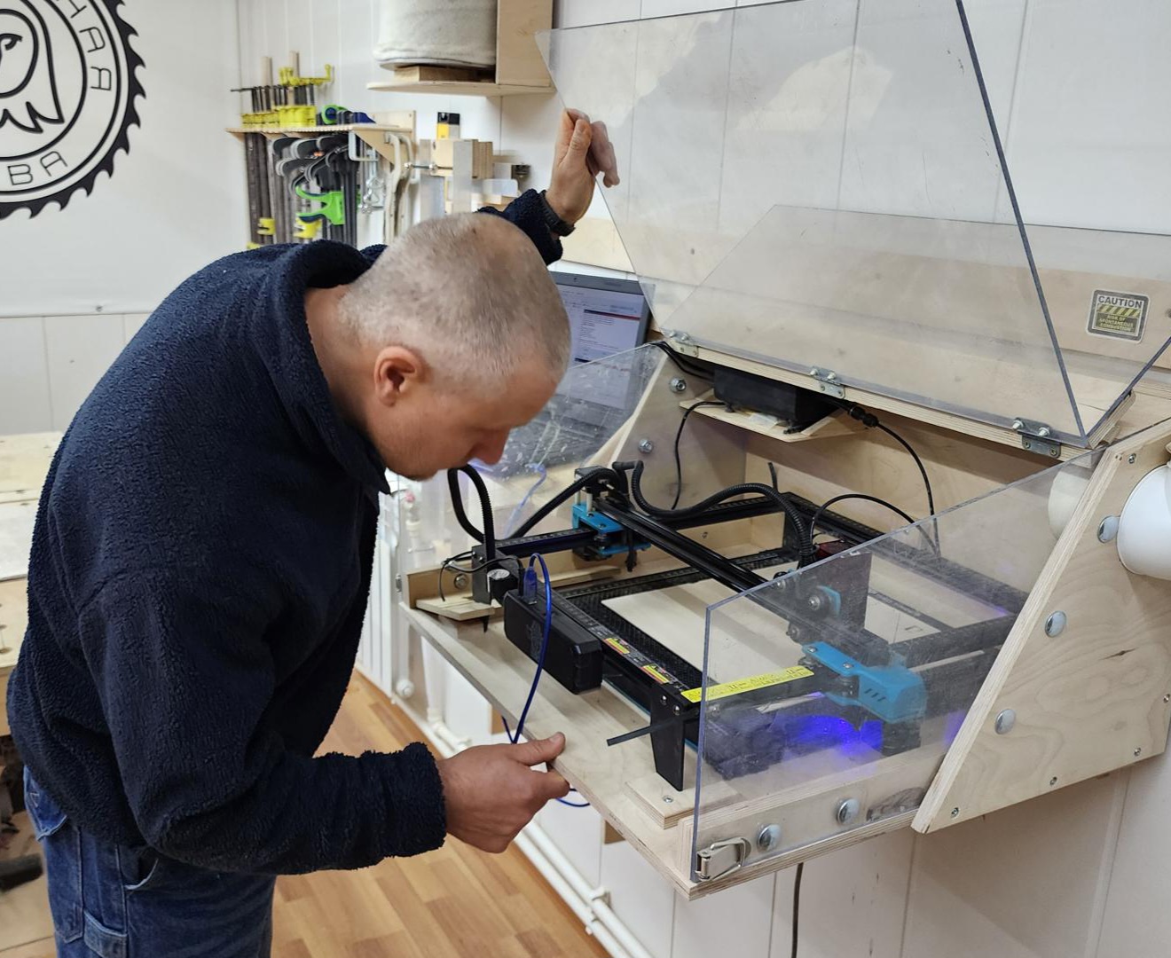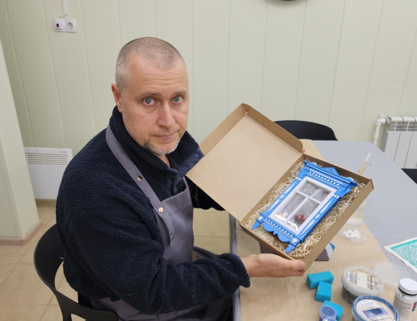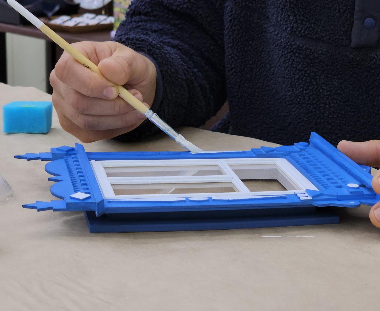 Для создания копии узор с реального наличника был оцифрован, после чего десятки мелких деталей вырезались на лазерном станке из фанеры. Готовая рама традиционно окрашивается в синий и белый цвета, а затем композиция наполняется жизнью: за окошком с занавеской видна стена с узорчатыми «обеями», на подоконнике размещаются фигурки кошки и цветка.