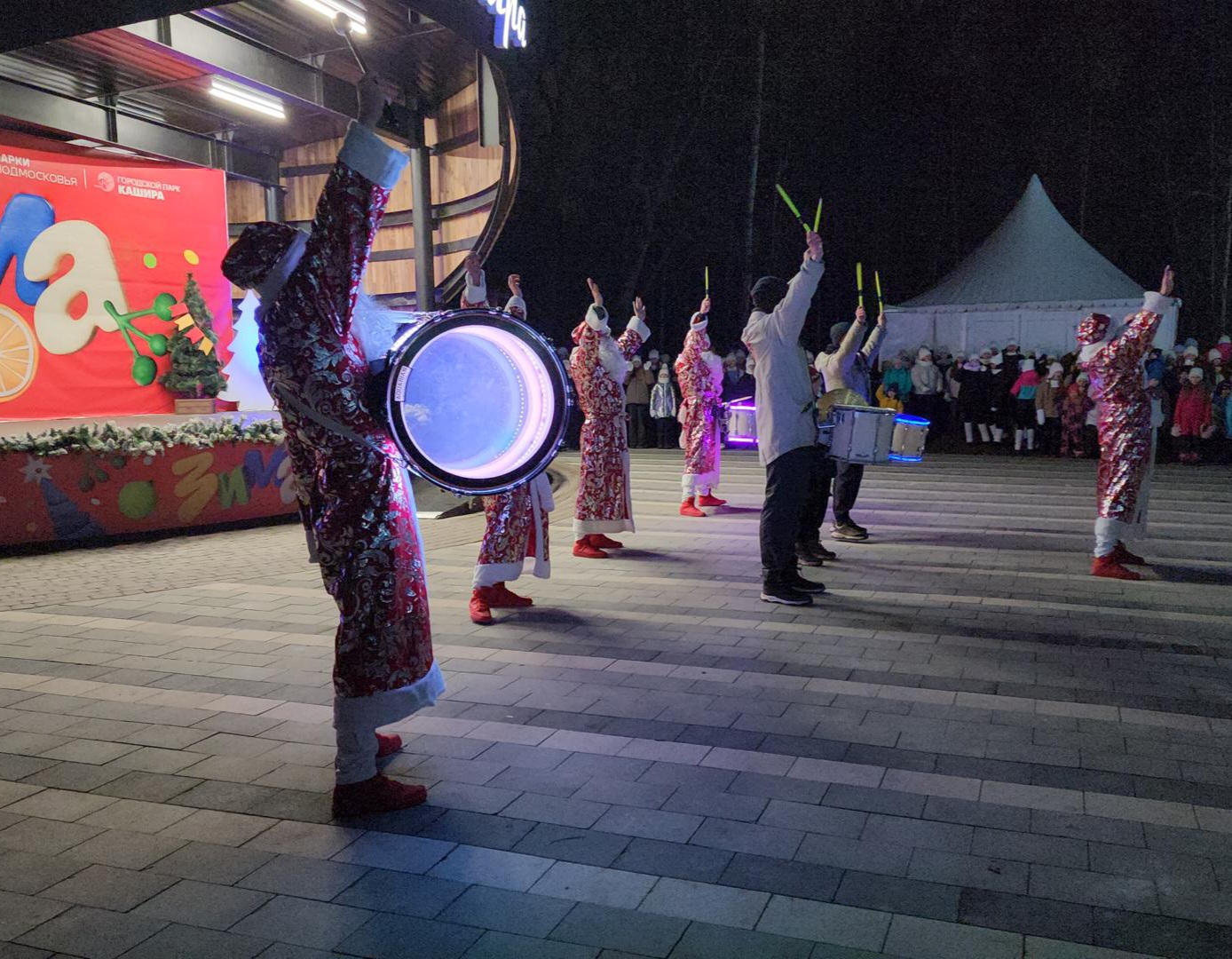 Официальное открытие зимнего сезона состоялось в городском парке Каширы. Мероприятие началось с праздничного шествия, которое возглавила колонна профессиональных барабанщиков, выступавших в стилизованных костюмах Деда Мороза.