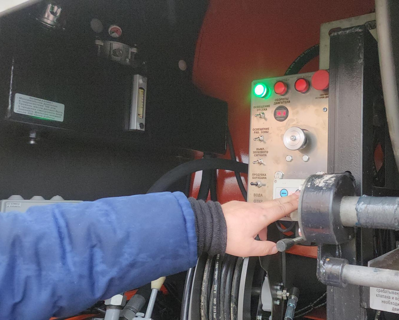 Машина представляет собой высокотехнологичный комплекс. Она оснащена мощной установкой, которая подает воду под давлением в 150 атмосфер, и 100-метровым рукавом с набором сменных насадок. Это позволяет чистить трубы разного диаметра — от 100 до 1000 мм. Емкость бака в восемь куб. м воды обеспечивает длительную автономную работу.
