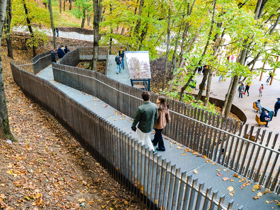 Экотропа длиной 134 м стала частью общего пешеходного маршрута парка, так как она соединяется с другими дорожками. По ней посетители могут прогуляться на уровне крон деревьев и полюбоваться красочными видами канала имени Москвы. Новый прогулочный маршрут оборудован стеклянными беседками, а возле тропы у воды располагается деревянная площадка с качелями и гамаками для спокойного отдыха.