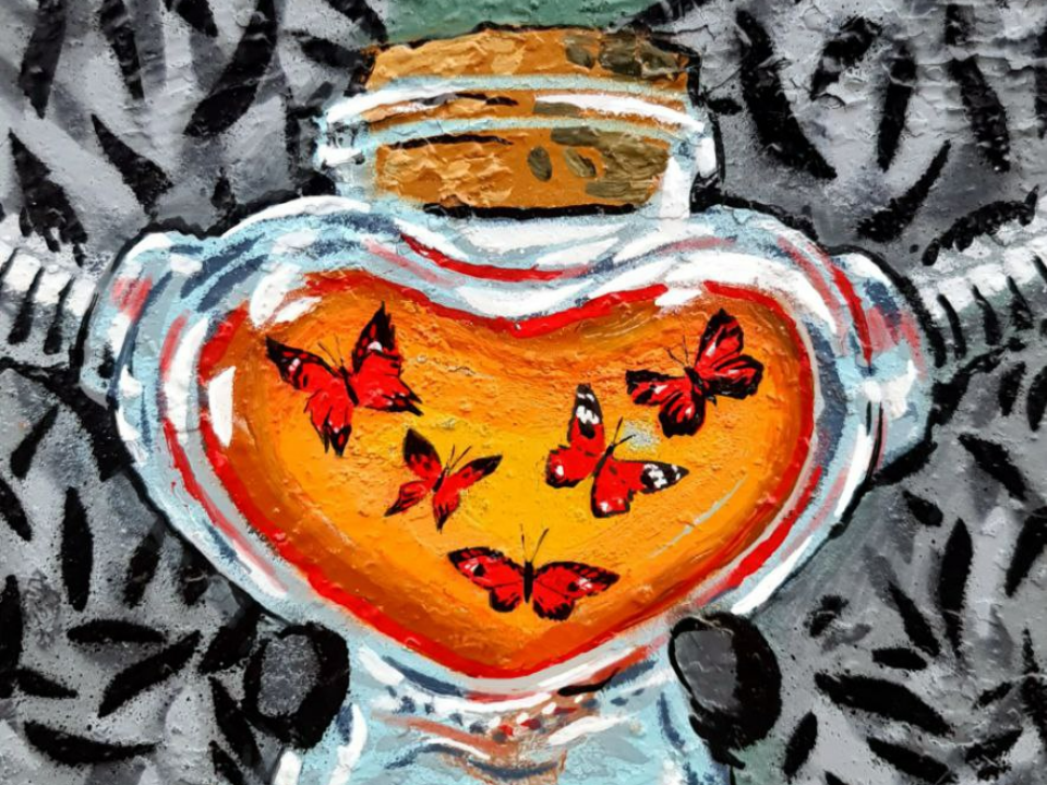 Граффити под названием «Бабочки» расположено на улице Совхозной, напротив дома 14. Художник представил знакомого всем персонажа в совершенно неожиданном, современном образе. Артем изобразил ежика ни одного, а вместе с подругой. «Колючие герои» стоят в противогазах, а вместо узнаваемого «узелка» из мультфильма у ежиков банка с бабочками.