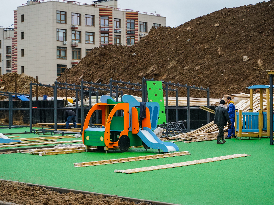 Сейчас на территории уже устанавливают горки, спортивные и игровые площадки. Благоустройство образовательного комплекса планируют завершить до конца ноября. Параллельно капитальный ремонт идет внутри здания. Строители завершают устройство фасада, проводят отделочные и инженерные работы. Совсем скоро специалисты запустят отопление и водоснабжение.