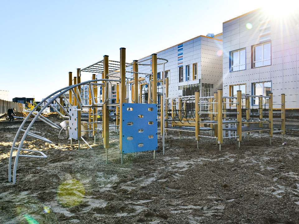 Сейчас на объекте строители завершают отделочные работы и монтаж инженерных систем. Параллельно специалисты благоустраивают прилегающую территорию. Во дворе уже установлены первые горки и лестницы для детей, также рабочие уложили новое асфальтовое покрытие.