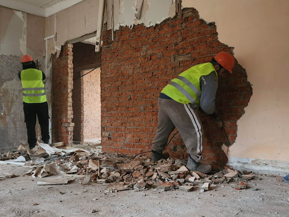 На объекте задействованы 46 специалистов и две единицы техники. По словам начальника строительного участка Ислама Казимагомедова, демонтажные работы выполнены на 96%. Рабочие штукатурят стены, вывозят строительный мусор, выполняют гидроизоляцию первого слоя кровли.