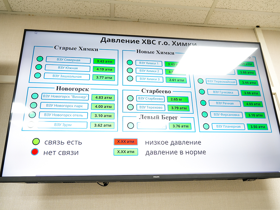 «Химкинский водоканал» обслуживает 20 водозаборных узлов, 21 водопроводную насосную станцию, 59 канализационных станций, а также более 450 км сетей водоснабжения и более 300 км водоотведения. В рамках трансформации диспетчерскую оснастили современной техникой и установили датчики на всех 20 ВЗУ округа.