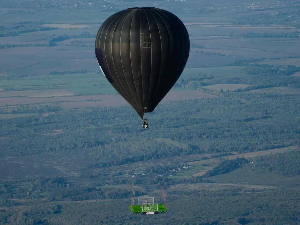 Путь к рекорду был непростым и занял целый год. Команда сменила четыре проектных бюро, прежде чем инженеры нашли решение, как поднять в небо футбольное поле размером 16*10 метров. Общий вес гигантской платформы составил 1,2 тонны, а общая масса всего подъема достигла целых 2518 кг. До этого никто в мире не решался поднять в воздух конструкцию таких масштабов.