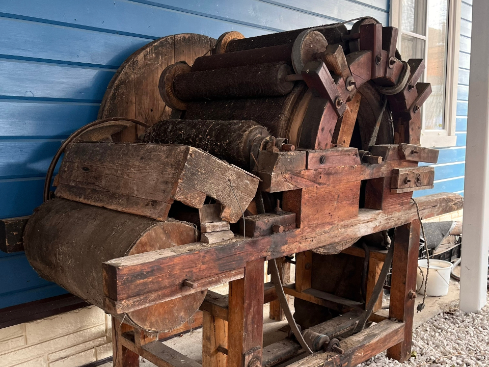 Машина имеет массивную деревянную конструкцию с металлическими деталями, включая большой вал и несколько меньших. Несмотря на свой вековой возраст, она прекрасно сохранилась.
