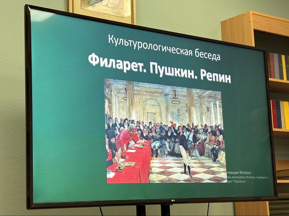 Далее Владимир Мормуль затронул тему живописного искусства, обратив внимание на картину Ильи Репина «Пушкин на экзамене в Царском Селе 8 января 1815 года». Он поведал слушателям, что знакомое многим изображение является всего лишь вторым вариантом произведения, меньшим по размеру, тогда как первоначальный оригинал скрывает еще много тайн. Рассказывая историю полотна, лектор также упомянул роль выдающегося церковного деятеля и писателя митрополита Филарета Дроздова, жившего одновременно с Пушкиным, чье духовное наследие оказывало значительное влияние на развитие культуры той эпохи.