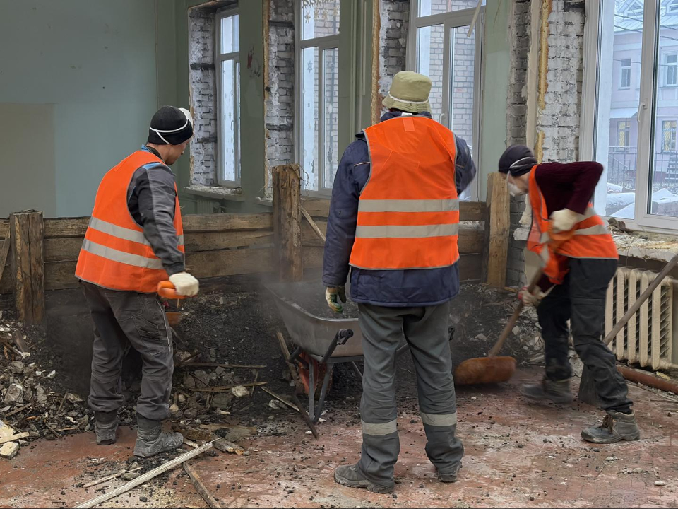 Подрядчики приступили к работам 10 ноября, начав с демонтажа старых конструкций: снимаются плитка и древесные перегородки, демонтируются покрытия пола, оконные и дверные конструкции первого уровня. Сейчас используется преимущественно ручной труд, тяжелая техника задействована лишь для вывоза строительного мусора.