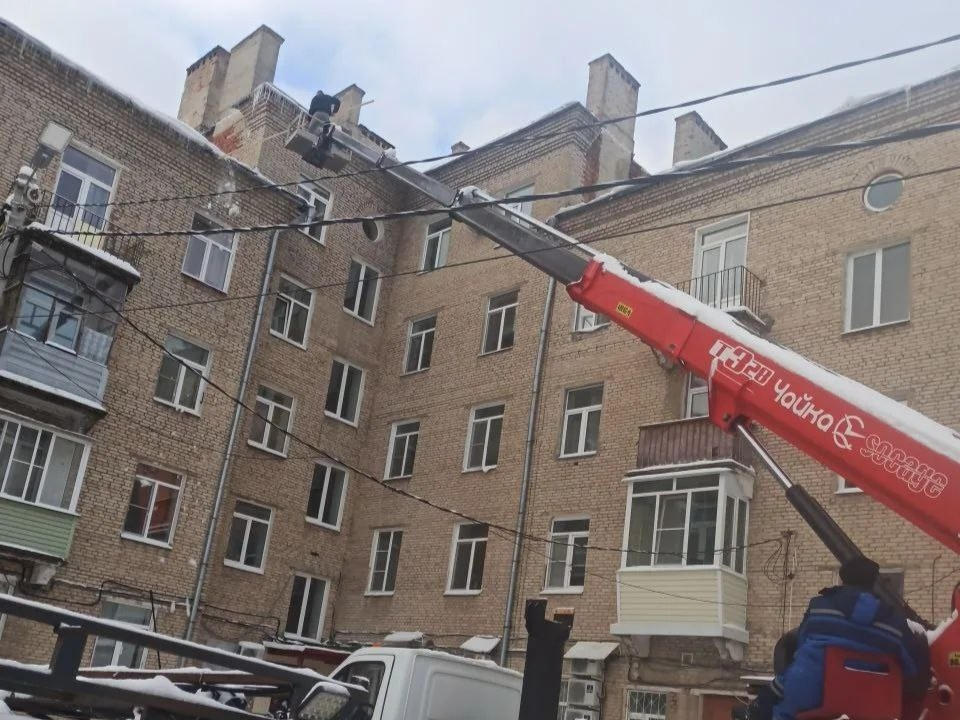 При помощи автовышек рабочие Департамента городского хозяйства счищают снежные завалы и сбивают опасные сосульки. Работе спецтехники очень мешает припаркованный транспорт: многие жители игнорируют объявления и не отгоняют свои машины.