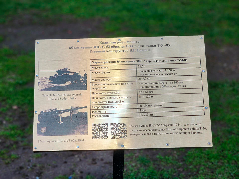 Современным дополнением стали информационные таблички с QR-кодами, установленные у противотанковых пушек и легендарного танка Т-34-85. С помощью смартфона посетители могут узнать подробную историю каждого экспоната.