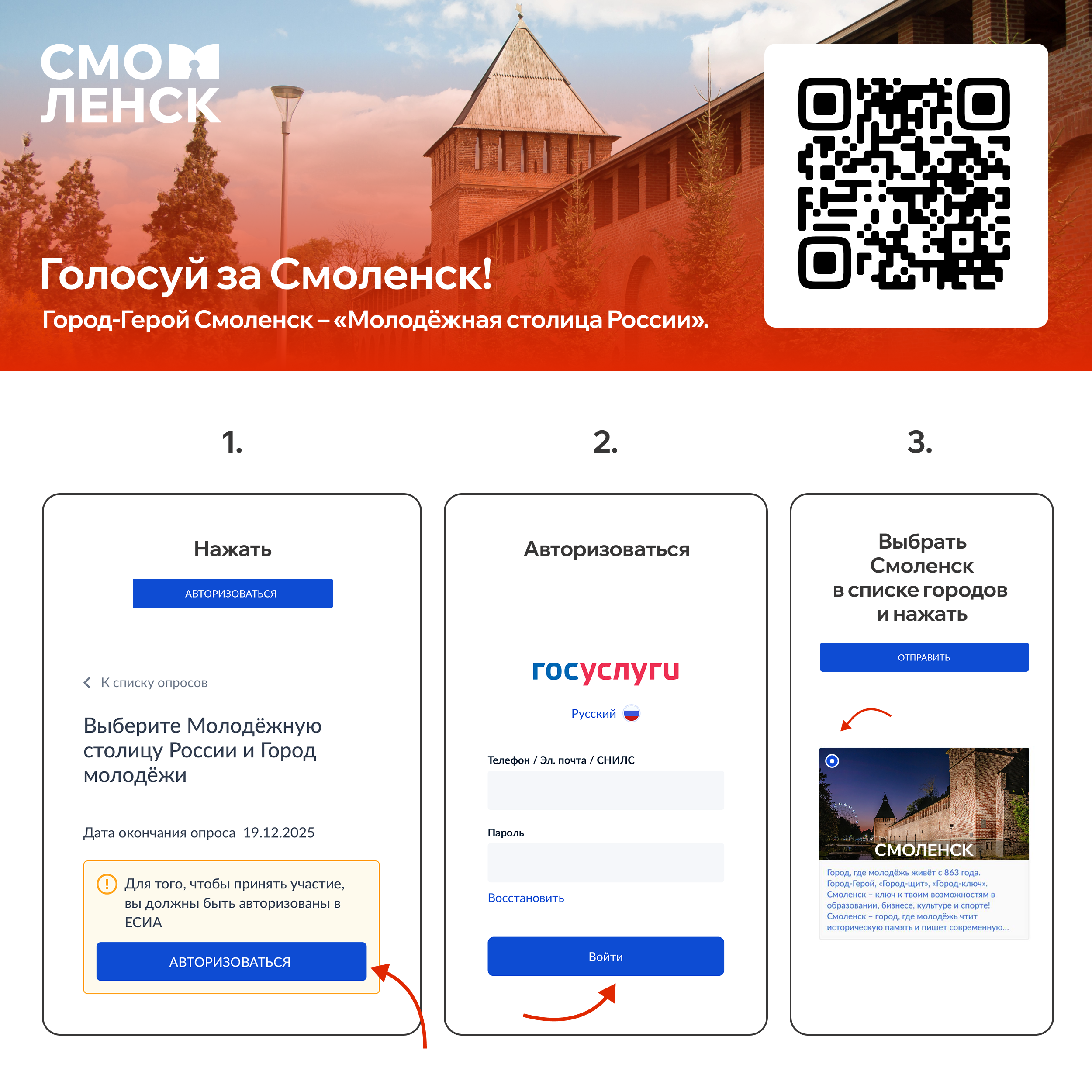 До 19 декабря жители Московской области могут решить судьбу всероссийского конкурса «Время молодых». На портале «Госуслуги» идет финальное голосование за города‑претенденты: Город‑Герой Смоленск борется за титул «Молодежная столица России — 2026», а Елец — за звание «Город молодежи».