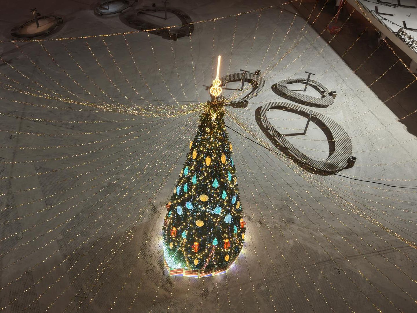 14-метровое дерево собирали и украшали несколько дней альпинисты с помощью автовышки. 80 гирлянд длиной 40 м каждая создают эффект «звездного неба». Елка украшена классическими игрушками в виде шишек, бумажных фонариков и лент серпантина.
