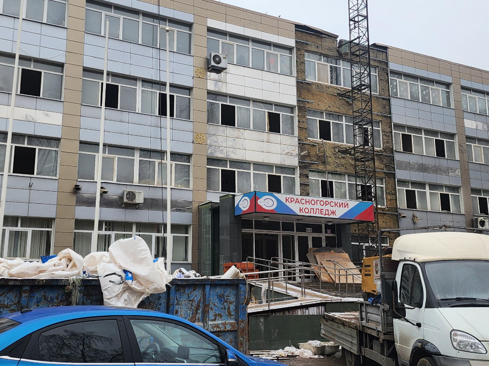 Продолжается масштабный капремонт здания Оптико-электронного колледжа в Красногорске. По словам представителя компании Алексея Проничева, почти завершен этап демонтажа старых конструкций: удалено примерно 90% покрытий, проведены необходимые изменения плана помещений в корпусе, включая удаление некоторых перегородок и элементов инженерии.