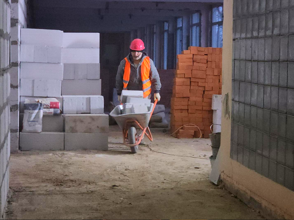 Представитель подрядчика Алексей Проничев сообщил, что на стройплощадке ежедневно работают около 20 квалифицированных сотрудников, задействованы строительные машины и оборудование. Основное внимание уделяется внутренним работам. Специалисты возводят внутренние стены и межклассовые перегородки, применяя современные стройматериалы, такие как газобетонные блоки и кирпичи. Проничев подчеркнул, что использование новых материалов обеспечит лучшую шумоизоляцию кабинетов, делая занятия более комфортными.